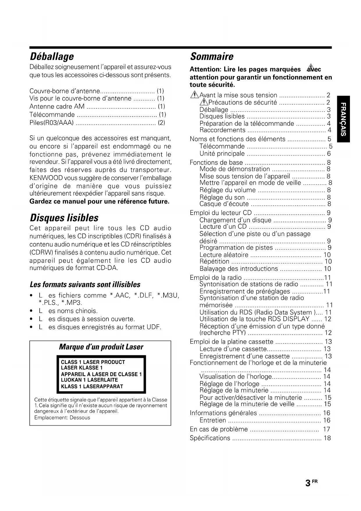 FRANÇAIS Before applying power Déballage Déballez soigneusement l’appareil et assurez-vous que tous les accessoires ci-dessous sont présents. Couvre-borne d’antenne.............................. (1) Vis pour le couvre-borne d’antenne ............ (1) Antenne cadre AM ...................................... (1) Télécommande ............................................ (1) Piles(R03/AAA) ............................................ (2) Si un quelconque des accessoires est manquant, ou encore si l’appareil est endommagé ou ne fonctionne pas, prévenez immédiatement le revendeur. Si l’appareil vous a été livré directement, faites des réserves auprès du transporteur. KENWOOD vous suggère de conserver l’emballage d’origine de manière que vous puissiez ultérieurement réexpédier l’appareil sans risque. Gardez ce manuel pour une référence future. Disques lisibles Cet appareil peut lire tous les CD audio numériques, les CD inscriptibles (CDR) finalisés à contenu audio numérique et les CD réinscriptibles (CDRW) finalisés à contenu audio numérique. Cet appareil peut également lire les CD audio numériques de format CD-DA. Les formats suivants sont illisibles
