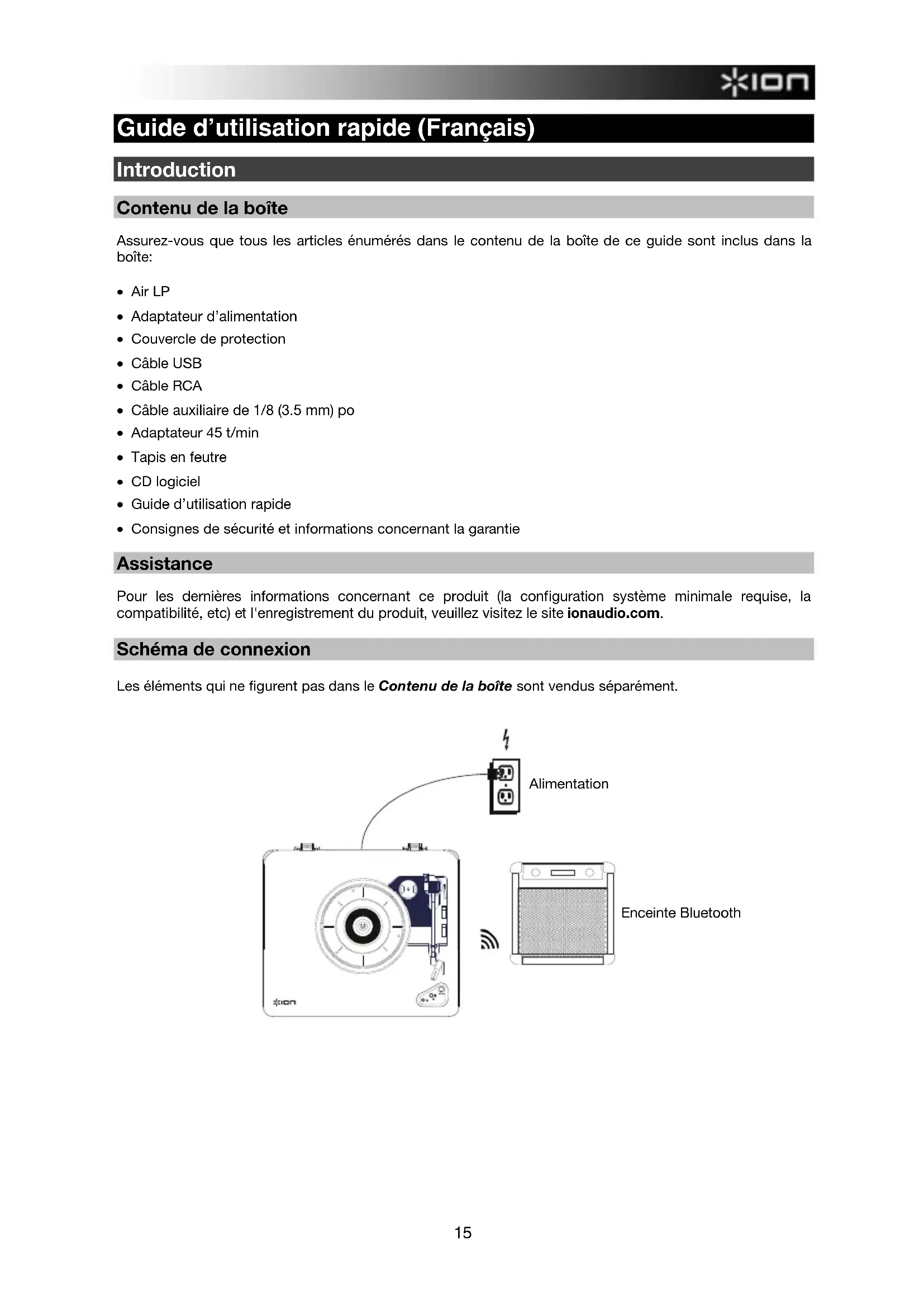 - Consignes de sécurité et informations concernant la garantie Assistance Pour les dernières informations concernant ce produit (la configuration système minimale requise, la compatibilité, etc) et l'enregistrement du produit, veuillez visitez le site ionaudio.com. Schéma de connexion Les éléments qui ne figurent pas dans le Contenu de la boîte sont vendus séparément.