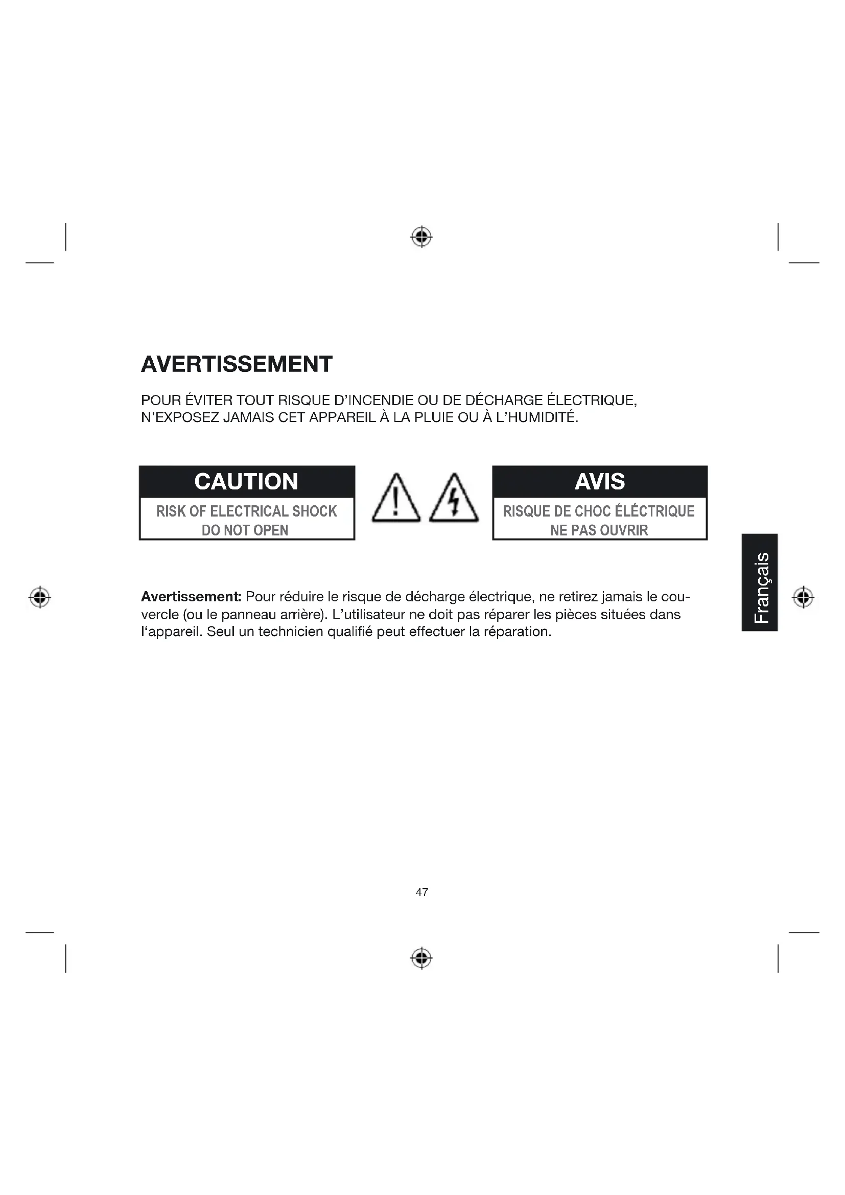 Avertissement: Pour réduire le risque de décharge électrique, ne retirez jamais le couvercle (ou le panneau arrêté). L'utilisateur ne doit pas réparer les pieces situées dans l'appareil. Seul un technicien qualifié peut effectuer la réparation.