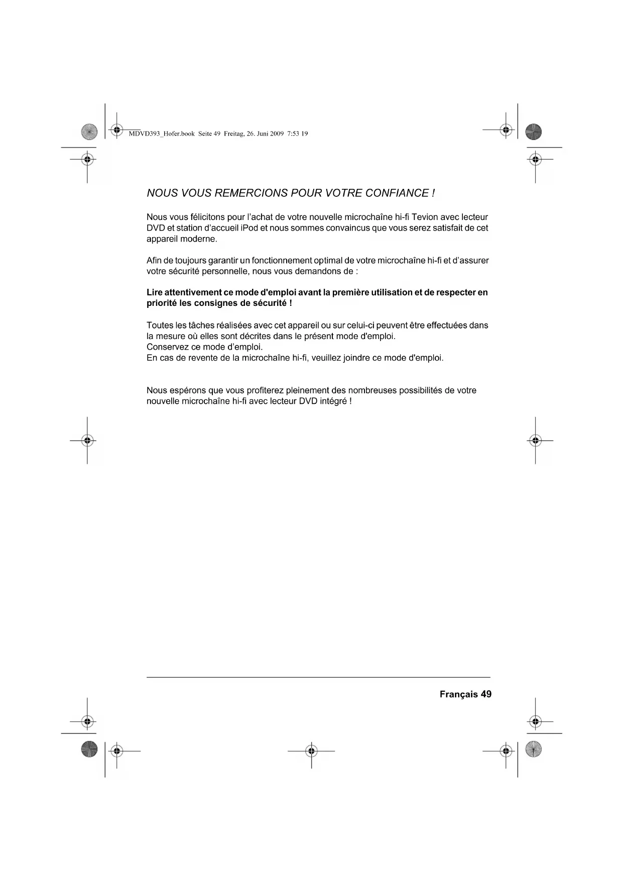 MDVD393_Hofer.book Seite 48 Freitag, 26. Juni 2009 7:53 19Français 49 NOUS VOUS REMERCIONS POUR VOTRE CONFIANCE ! Nous vous félicitons pour l’achat de votre nouvelle microchaîne hi-fi Tevion avec lecteur DVD et station d’accueil iPod et nous sommes convaincus que vous serez satisfait de cet appareil moderne. Afin de toujours garantir un fonctionnement optimal de votre microchaîne hi-fi et d’assurer votre sécurité personnelle, nous vous demandons de : Lire attentivement ce mode d'emploi avant la première utilisation et de respecter en priorité les consignes de sécurité ! Toutes les tâches réalisées avec cet appareil ou sur celui-ci peuvent être effectuées dans la mesure où elles sont décrites dans le présent mode d'emploi. Conservez ce mode d’emploi. En cas de revente de la microchaîne hi-fi, veuillez joindre ce mode d'emploi. Nous espérons que vous profiterez pleinement des nombreuses possibilités de votre nouvelle microchaîne hi-fi avec lecteur DVD intégré ! MDVD393_Hofer.book Seite 49 Freitag, 26. Juni 2009 7:53 1950 Français