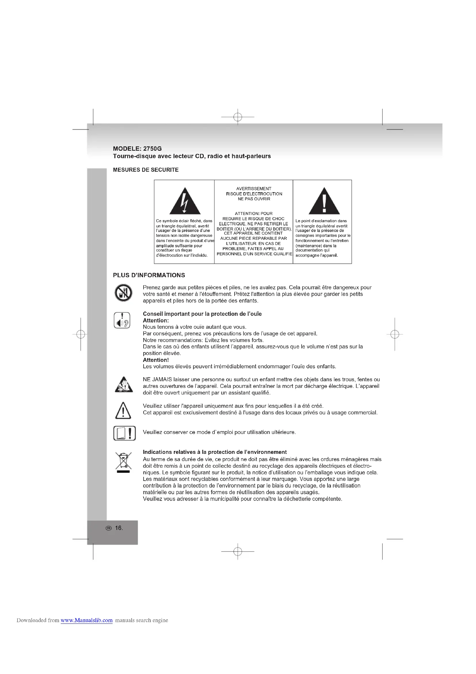 MODELE: 2750G Tourne-disque avec lecteur CD, radio et haut-parleurs MESURES DE SECURITEAVERTISSEMENTRISQUE D'ELECTROCUTIONNE PAS OUVRIRATTENTION: POUR REDUIRE LE RISQUE DE CHOC ELECTRIQUE, NE PAS RETIRER LE BOITIER (OU L’ARRIERE DU BOITIER). CET APPAREIL NE CONTIENT AUCUNE PIECE REPARABLE PAR L’UTILISATEUR. EN CAS DE PROBLEME, FAITES APPEL AU PERSONNEL D’UN SERVICE QUALIFIE.Le point d’exclamation dans un triangle équilatéral avertit l’usager de la présence de consignes importantes pour le fonctionnement ou l’entretien (maintenance) dans la documentation qui accompagne l’appareil.Ce symbole éclair fléché, dans un triangle équilatéral, avertit l’usager de la présence d’une tension non isolée dangereuse dans l’enceinte du produit d’une amplitude suffisante pour constituer un risque d’électrocution sur l’individu.Prenez garde aux petites pièces et piles, ne les avalez pas. Cela pourrait être dangereux pour votre santé et mener à l'étouffement. Prêtez l'attention la plus élevée pour garder les petits appareils et piles hors de la portée des enfants.Conseil important pour la protection de l’ouïeAttention:Nous tenons à votre ouïe autant que vous.Par conséquent, prenez vos précautions lors de l’usage de cet appareil.Notre recommandations: Evitez les volumes forts.Dans le cas où des enfants utilisent l’appareil, assurez-vous que le volume n’est pas sur la position élevée.Attention!Les volumes élevés peuvent irrémédiablement endommager l’ouïe des enfants.NE JAMAIS laisser une personne ou surtout un enfant mettre des objets dans les trous, fentes ou autres ouvertures de l’appareil. Cela pourrait entraîner la mort par décharge électrique. L’appareil doit être ouvert uniquement par un assistant qualifié.Veuillez utiliser l'appareil uniquement aux fins pour lesquelles il a été créé.Cet appareil est exclusivement destiné à l'usage dans des locaux privés ou à usage commercial.Veuillez conserver ce mode d`emploi pour utilisation ultérieure.Indications relatives à la protection de l’environnementAu terme de sa durée de vie, ce produit ne doit pas être éliminé avec les ordures ménagères mais doit être remis à un point de collecte destiné au recyclage des appareils électriques et électro-niques. Le symbole figurant sur le produit, la notice d’utilisation ou l’emballage vous indique cela.Les matériaux sont recyclables conformément à leur marquage. Vous apportez une large contribution à la protection de l’environnement par le biais du recyclage, de la réutilisation matérielle ou par les autres formes de réutilisation des appareils usagés.Veuillez vous adresser à la municipalité pour connaître la déchetterie compétente. Downloaded from www.Manualslib.com manuals search engine17.