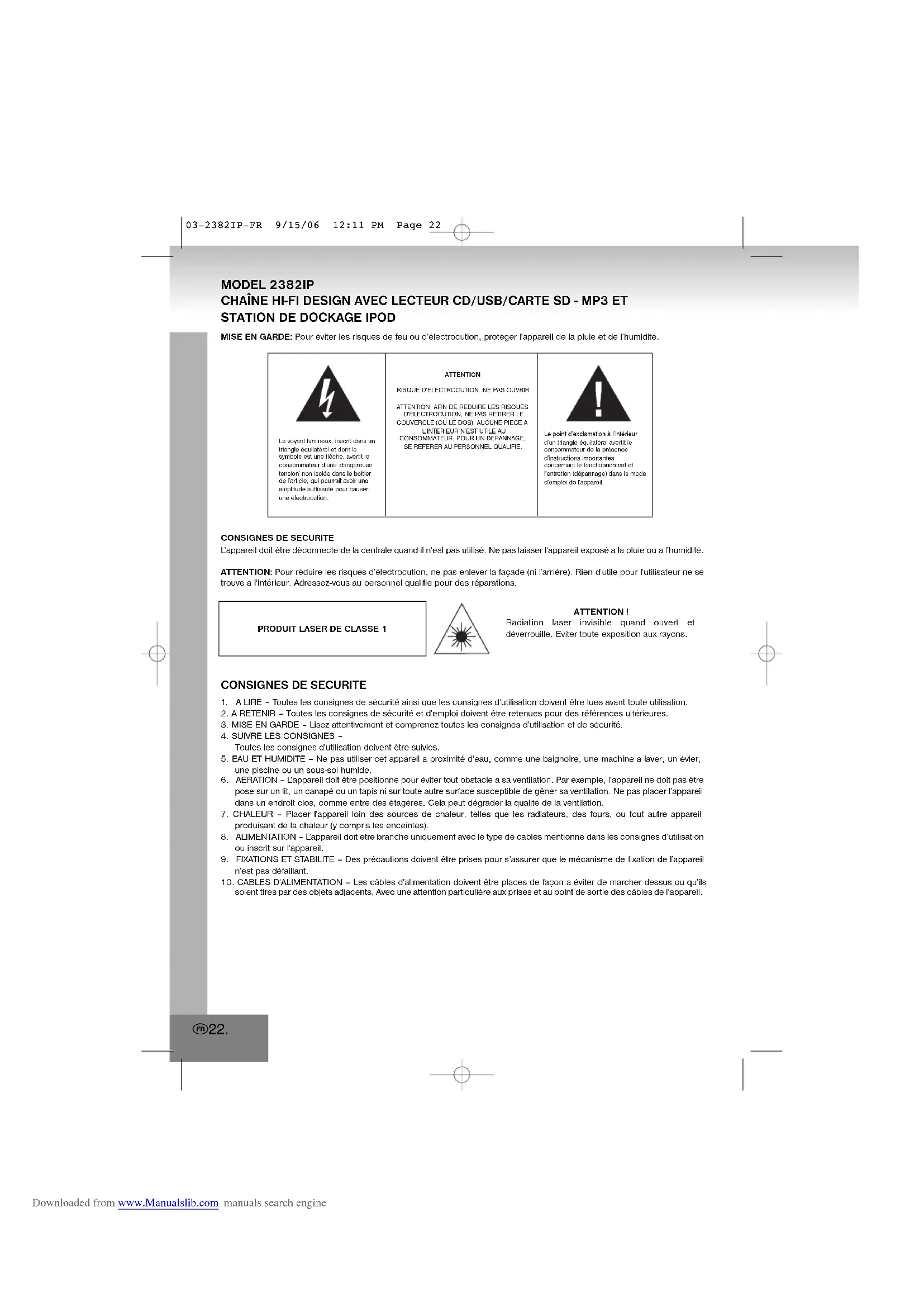 Le voyant lumineux, inscrit dans untriangle équilatéral et dont lesymbole est une flèche, avertit leconsommateur d’une ‘dangereusetension’ non isolée dans le boîtierde l’article, qui pourrait avoir uneamplitude suffisante pour causerune électrocution.ATTENTIONRISQUE D’ELECTROCUTION. NE PAS OUVRIRATTENTION: AFIN DE REDUIRE LES RISQUESD’ELECTROCUTION, NE PAS RETIRER LECOUVERCLE (OU LE DOS). AUCUNE PIECE AL’INTERIEUR N’EST UTILE AUCONSOMMATEUR. POUR UN DEPANNAGE,SE REFERER AU PERSONNEL QUALIFIE.Le point d’exclamation à l’intérieurd’un triangle équilatéral avertit leconsommateur de la présenced’instructions importantesconcernant le fonctionnement etl’entretien (dépannage) dans le moded’emploi de l’appareil.PRODUIT LASER DE CLASSE 1ATTENTION !Radiation laser invisible quand ouvert etdéverrouille. Eviter toute exposition aux rayons. 03-2382IP-FR 9/15/06 12:11 PM Page 22 Downloaded from www.Manualslib.com manuals search engine11. ENTRETIEN – L’appareil doit être nettoyé exclusivement comme recommandé par le constructeur.