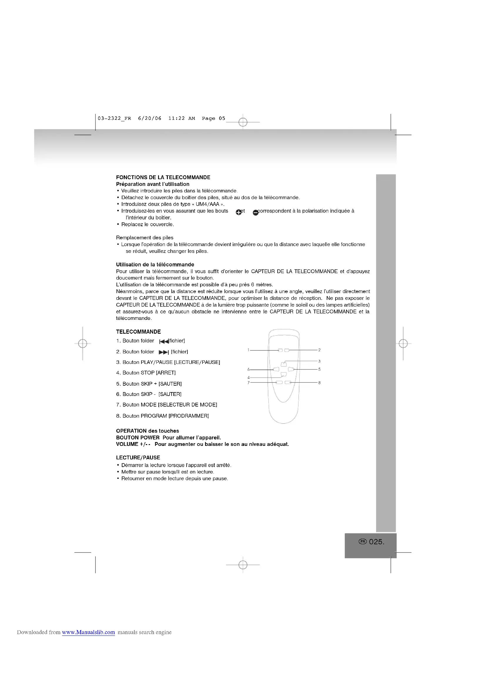 03-2322_FR 6/20/06 11:22 AM Page 04 Downloaded from www.Manualslib.com manuals search engineFONCTIONS DE LA TELECOMMANDEPréparation avant l’utilisation• Veuillez introduire les piles dans la télécommande.• Détachez le couvercle du boîtier des piles, situé au dos de la télécommande.• Introduisez deux piles de type « UM4/AAA ».• Introduisez-les en vous assurant que les bouts et correspondent à la polarisation indiquée à l’intérieur du boîtier.• Replacez le couvercle.Remplacement des piles• Lorsque l’opération de la télécommande devient irrégulière ou que la distance avec laquelle elle fonctionnese réduit, veuillez changer les piles.Utilisation de la télécommandePour utiliser la télécommande, il vous suffit d’orienter le CAPTEUR DE LA TELECOMMANDE et d’appuyezdoucement mais fermement sur le bouton.L’utilisation de la télécommande est possible d’à peu près 6 mètres.Néanmoins, parce que la distance est réduite lorsque vous l’utilisez à une angle, veuillez l’utiliser directementdevant le CAPTEUR DE LA TELECOMMANDE, pour optimiser la distance de réception. Ne pas exposer leCAPTEUR DE LA TELECOMMANDE à de la lumière trop puissante (comme le soleil ou des lampes artificielles)et assurez-vous à ce qu’aucun obstacle ne intervienne entre le CAPTEUR DE LA TELECOMMANDE et latélécommande.TELECOMMANDE1. Bouton folder [fichier] 2. Bouton folder [fichier]3. Bouton PLAY/PAUSE [LECTURE/PAUSE]4. Bouton STOP [ARRET]5. Bouton SKIP + [SAUTER]6. Bouton SKIP - [SAUTER]7. Bouton MODE [SELECTEUR DE MODE]8. Bouton PROGRAM [PRODRAMMER]OPERATION des touchesBOUTON POWER Pour allumer l’appareil.VOLUME +/- - Pour augmenter ou baisser le son au niveau adéquat.LECTURE/PAUSE• Démarrer la lecture lorsque l’appareil est arrêté.• Mettre sur pause lorsqu’il est en lecture.• Retourner en mode lecture depuis une pause.