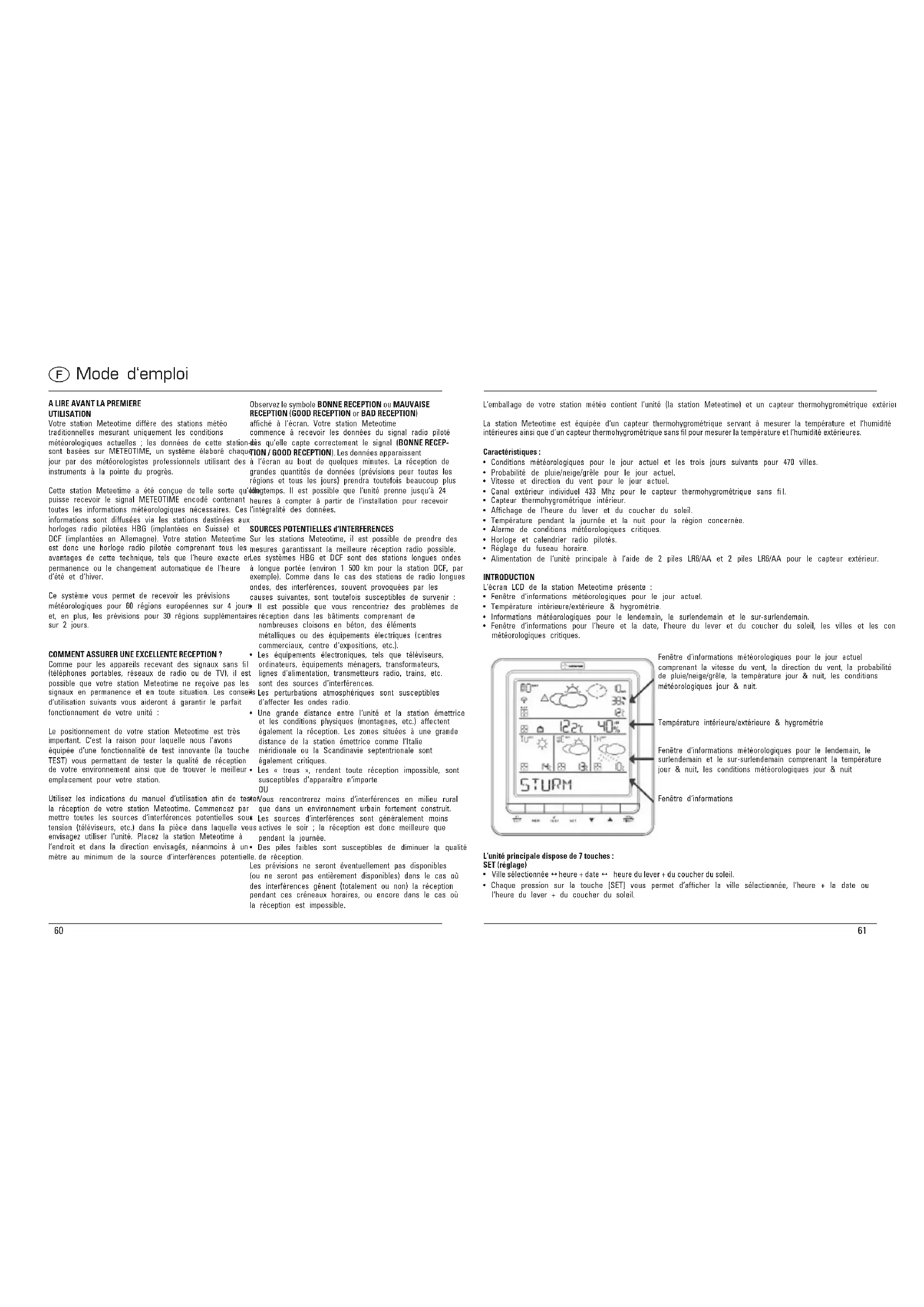 UTILISATION Votre station Meteotime diffère des stations météo traditionnelles mesurant uniquement les conditions météorologiques actuelles ; les données de cette station-ci sont basées sur METEOTIME, un système élaboré chaque jour par des météorologistes professionnels utilisant des instruments à la pointe du progrès. Cette station Meteotime a été conçue de telle sorte qu‘elle puisse recevoir le signal METEOTIME encodé contenant toutes les informations météorologiques nécessaires. Ces informations sont diffusées via les stations destinées aux horloges radio pilotées HBG (implantées en Suisse) et DCF (implantées en Allemagne). Votre station Meteotime est donc une horloge radio pilotée comprenant tous les avantages de cette technique, tels que l‘heure exacte en permanence ou le changement automatique de l‘heure d‘été et d‘hiver. Ce système vous permet de recevoir les prévisions météorologiques pour 60 régions européennes sur 4 jours et, en plus, les prévisions pour 30 régions supplémentaires sur 2 jours. COMMENT ASSURER UNE EXCELLENTE RECEPTION ? Comme pour les appareils recevant des signaux sans l (téléphones portables, réseaux de radio ou de TV), il est possible que votre station Meteotime ne reçoive pas les signaux en permanence et en toute situation. Les conseils d‘utilisation suivants vous aideront à garantir le parfait fonctionnement de votre unité : Le positionnement de votre station Meteotime est très important. C‘est la raison pour laquelle nous l‘avons équipée d‘une fonctionnalité de test innovante (la touche TEST) vous permettant de tester la qualité de réception de votre environnement ainsi que de trouver le meilleur emplacement pour votre station. Utilisez les indications du manuel d‘utilisation an de tester la réception de votre station Meteotime. Commencez par mettre toutes les sources d‘interférences potentielles sous tension (téléviseurs, etc.) dans la pièce dans laquelle vous envisagez utiliser l‘unité. Placez la station Meteotime à l‘endroit et dans la direction envisagés, néanmoins à un mètre au minimum de la source d‘interférences potentielle. Observez le symbole BONNE RECEPTION ou MAUVAISE RECEPTION (GOOD RECEPTION or BAD RECEPTION) afché à l‘écran. Votre station Meteotime commence à recevoir les données du signal radio piloté dès qu‘elle capte correctement le signal (BONNE RECEP- TION / GOOD RECEPTION). Les données apparaissent à l‘écran au bout de quelques minutes. La réception de grandes quantités de données (prévisions pour toutes les régions et tous les jours) prendra toutefois beaucoup plus longtemps. Il est possible que l‘unité prenne jusqu‘à 24 heures à compter à partir de l‘installation pour recevoir l‘intégralité des données. SOURCES POTENTIELLES d‘INTERFERENCES Sur les stations Meteotime, il est possible de prendre des mesures garantissant la meilleure réception radio possible. Les systèmes HBG et DCF sont des stations longues ondes à longue portée (environ 1 500 km pour la station DCF, par exemple). Comme dans le cas des stations de radio longues ondes, des interférences, souvent provoquées par les causes suivantes, sont toutefois susceptibles de survenir :