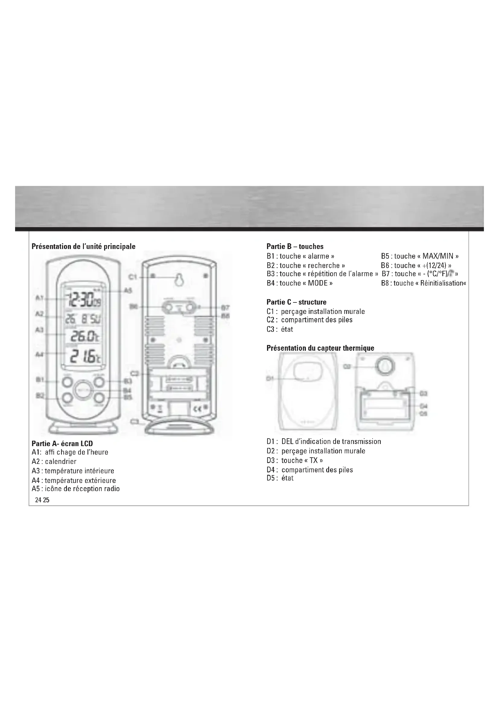 Partie A- écran LCD A1: affi chage de l’heure A2 : calendrier A3 : température intérieure A4 : température extérieure A5 : icône de réception radio Partie B – touches B1 : touche « alarme » B5 : touche « MAX/MIN » B2 : touche « recherche » B6 : touche « +(12/24) » B3 : touche « répétition de l’alarme » B7 : touche « - (°C/°F)/ » B4 : touche « MODE » B8 : touche « Réinitialisation« Partie C – structure C1 : perçage installation murale C2 : compartiment des piles C3 : état Présentation du capteur thermique D1 : DEL d’indication de transmission D2 : perçage installation murale D3 : touche « TX » D4 : compartiment des piles D5 : état