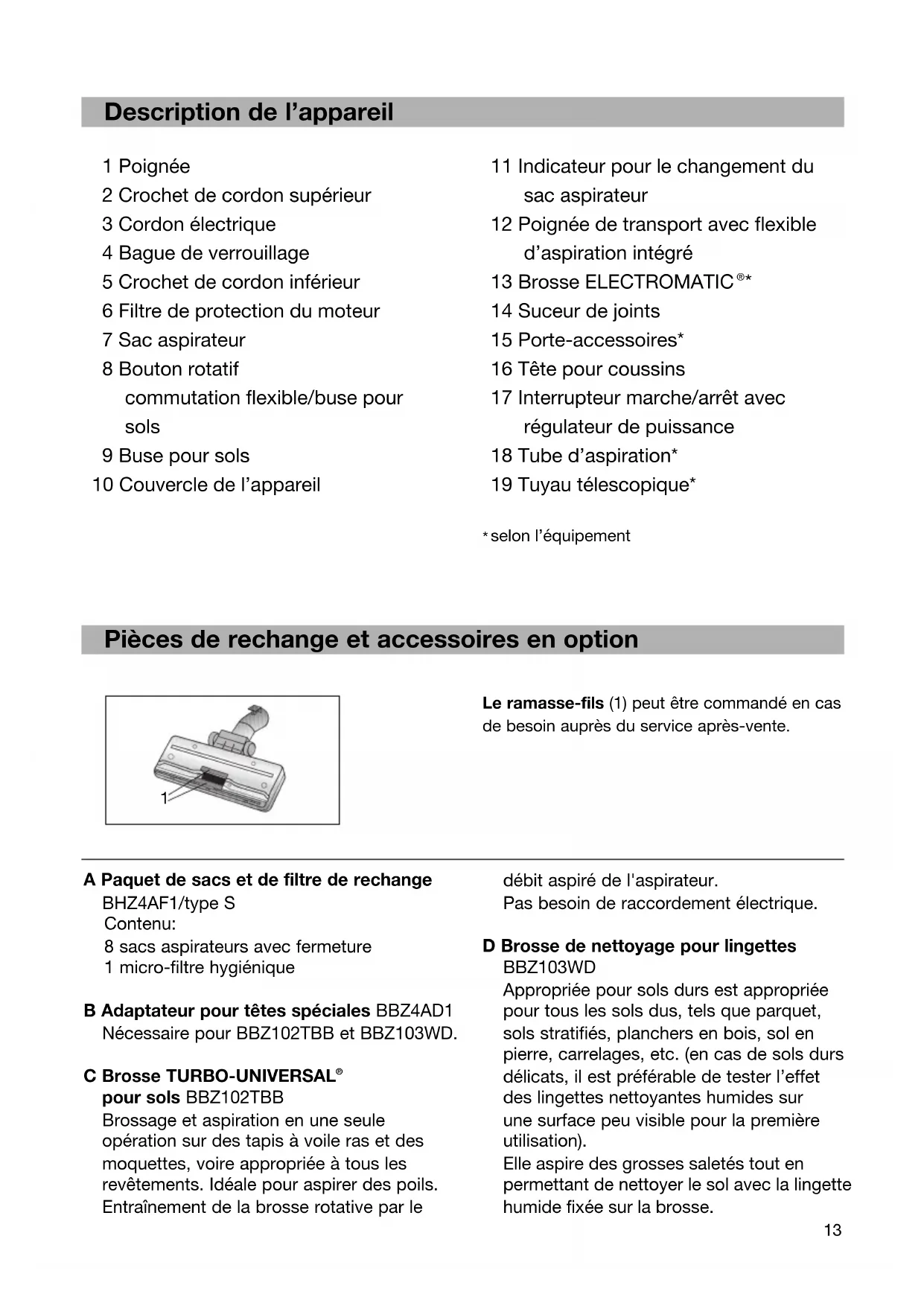 selon l’équipement Pièces de rechange et accessoires en option A Paquet de sacs et de filtre de rechange BHZ4AF1/type S Contenu: 8 sacs aspirateurs avec fermeture 1 micro-filtre hygiénique B Adaptateur pour têtes spéciales BBZ4AD1 Nécessaire pour BBZ102TBB et BBZ103WD. C Brosse TURBO-UNIVERSAL