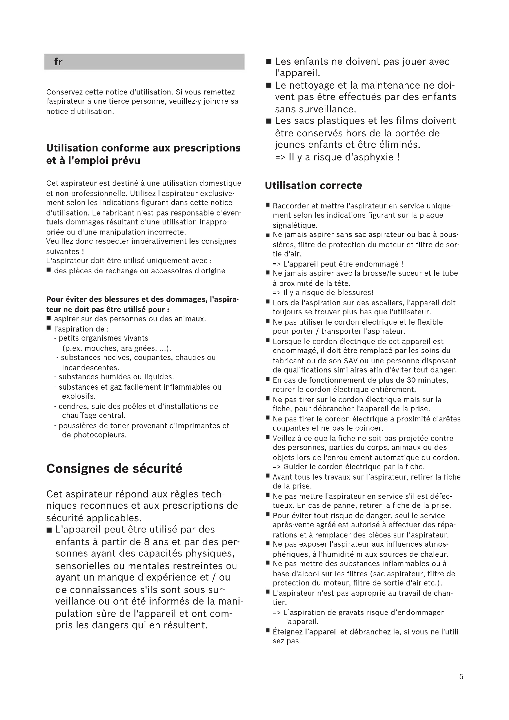 'aspirateur à une tierce personne, veuillez-y joindre sa notice d'utilisation. Utilisation conforme aux prescriptions et à l'emploi prévu Cet aspirateur est destiné à une utilisation domestique et non professionnelle. Utilisez l'aspirateur exclusive- ment selon les indications figurant dans cette notice