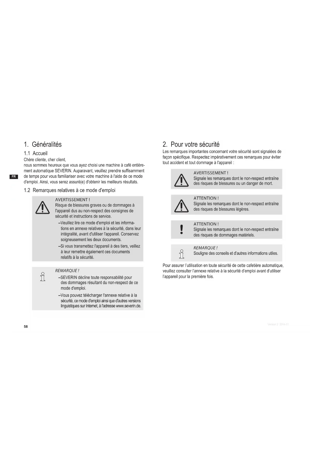 Les remarques importantes concernant votre sécurité sont signalées de façon spécique. Respectez impérativement ces remarques pour éviter tout accident et tout dommage à l'appareil : AVERTISSEMENT! Signale les remarques dont le non-respect entraîne des risques de blessures ou un danger de mort. ATTENTION! Signale les remarques dont le non-respect entraîne des risques de blessures légères. ATTENTION! Signale les remarques dont le non-respect entraîne des risques de dommages matériels. REMARQUE! Souligne des conseils et d'autres informations utiles. Pour assurer l’utilisation en toute sécurité de cette cafetière automatique, veuillez consulter l’annexe relative à la sécurité d’emploi avant d’utiliser l’appareil pour la première fois.59 Version 2 2014-11