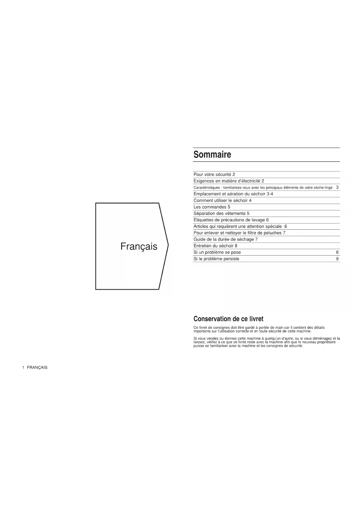 Please make sure you have all these details ready when you call. Please remember your new appliance is a complex piece of equipment. ‘DIY” repairs or unqualified and untrained service people may put you in danger, could damage the appliance, and might mean you lose cover under the Parts Guarantee. If you do experience a problem with the appliance don’t take risks, call in our Service Engineer. Our Spare Parts are designed exclusively to fit your appliance. Do not use them for any other purpose as you may create a safety hazard. To minimise the risk of injury to children please dispose of your product safely. The door and lid should be removed and mains cable cut off flush with the appliance ensuring that the mains plug can no longer be plugged into a mains socket. The items must then be disposed of safely. This appliance conforms to the following EEC Directives. Low Voltage Equipment 72/23/EEC 93/68/EEC Electromagnetic Compatibility 89/336/EEC 92/31/EEC 93/68/EEC Contact the Service OfficeFrançais 1 FRANÇAIS Pour votre sécurité 2 Exigences en matière d’électricité 2 Caractéristiques - familiarisez-vous avec les principaux éléments de votre sèche-linge 3 Emplacement et aération du séchoir 3-4 Comment utiliser le séchoir 4 Les commandes 5 Séparation des vêtements 5 Etiquettes de précautions de lavage 6 Articles qui requièrent une attention spéciale 6 Pour enlever et nettoyer le filtre de peluches 7 Guide de la durée de séchage 7 Entretien du séchoir 8 Si un problème se pose 8 Si le problème persiste 9 Sommaire Conservation de ce livret Ce livret de consignes doit être gardé à portée de main car il contient des détails importants sur l’utilisation correcte et en toute sécurité de cette machine. Si vous vendez ou donnez cette machine à quelqu’un d’autre, ou si vous déménagez et la laissez, veillez à ce que ce livret reste avec la machine afin que le nouveau propriétaire puisse se familiariser avec la machine et les consignes de sécurité.FRANÇAIS 2 Pour votre sécurité NE JAMAIS ● Laisser les enfants jouer avec le séchoir ou nuire à son fonctionnement NE JAMAIS ● Laisser s’obstruer l’entrée d’air à l’arrière du séchoir, la sortie d’air ou le conduit d’aération. NE JAMAIS ● Diriger la bouche du conduit d’aération vers l’entrée d’air à l’arrière de la machine. NE JAMAIS ● Laisser le séchoir rotatif recycler l’air d’échappement. NE JAMAIS ● Eteindre la machine en laissant une charge encore chaude dans le tambour. NE JAMAIS ● Faire sécher si le filtre n’est pas en place. NE JAMAIS ● Dépasser la charge maximale recommandée ou placer des articles qui dégouttent dans le tambour. NE JAMAIS ● Utiliser le séchoir sur un tapis dont les fibres empêchent l’air de pénétrer dans le séchoir pas le dessous. NE JAMAIS ● Permettre aux peluches de s’accumuler autour du séchoir. NE JAMAIS ● Ajouter de conditionneur de tissu liquide ou en feuille, utiliser le conditionneur liquide au rinçage final durant le lavage. NE JAMAIS ● Utiliser le séchoir pour un usage commercial, ce séchoir ne convient qu’à un usage domestique. NE JAMAIS ● Sécher d’acryliques à une température élevée. NE JAMAIS ● Sécher des articles qui N’ONT PAS été bien lavés à l’eau et au savon, puis bien rincés et essorés. NE JAMAIS ● Faire sécher au sèche-linge des chiffons ou autres qui ont été utilisés avec des détergents ou produits de nettoyage chimiques. NE JAMAIS ● Sécher d’articles contaminés par des produits inflammables comme l’essence, l’huile, la peinture, la laque pour cheveux, les crèmes, la graisse ou l’huile de cuisson. NE JAMAIS ● Sécher avec le séchoir rotatif : caoutchouc, caoutchouc mousse, plastique, mousse de plastique, couches pour bébés ou sacs- poubelles, polythène ou papier. De gros articles encombrants y compris les couettes et sacs de couchage. NE JAMAIS ● Tenter de se tenir debout sur le séchoir; il n’a pas été conçu à cet effet et vous pourriez vous blesser et endommager l’appareil par un tel traitement. NE JAMAIS ● Mettre sous tension ou hors tension si vous mains sont mouillées. IMPORTANT Votre séchoir rotatif est facile à utiliser. Pour votre propre sécurité et pour tirer le meilleur parti de l’appareil, il est toutefois impor- tant de connaître votre séchoir et de lire entièrement ce manuel avant d’utiliser le séchoir la première fois. UN ENFANT PEUT MONTER DANS LE SECHOIR OU LE DEREGLER SI L’APPAREIL EST LAISSE SANS SURVEILLANCE. QUAND LA MACHINE N’EST PAS UTILISEE, L’ETEINDRE, RETIRER LA FICHE ET FERMER LA PORTE. IMPORTANT Pour votre sécurité TOUJOURS ● Eteindre l’appareil, retirer la fiche électrique et fermer la porte de la machine quand elle n’est pas utilisée. TOUJOURS ● Se conformer aux exigences électriques spécifiées. TOUJOURS ● S’assurer que le séchoir est correctement installé et jouit d’une aération adéquate. (voir “Emplacement et aération du séchoir.”) TOUJOURS ● Utiliser la conduite d’aération pour obtenir un séchage optimum. TOUJOURS ● Terminer chaque programme par un cycle à l’air frais disponible sur la commande. TOUJOURS ● Nettoyer le filtre, il est essentiel que le filtre ne soit jamais obstrué par des peluches. TOUJOURS ● Observer les règles de séchage des vêtements : Les articles de laine, en particulier, ne doivent pas être placés dans le séchoir rotatif s’ils n’ont pas d’étiquette «Super lavage» , «Lavable à la machine» ou le symbole «Convient à un séchoir rotatif»: En cas de doute, ne pas sécher de laine dans la machine. Contrairement à d’autre matériel, le rétrécissement de la laine est irréversible, c’est-à-dire que la laine ne retrouve pas sa forme et sa taille originales. TOUJOURS ● Acheter des accessoires et des pièces de rechange d’origine. Exigences en matière d’électricité REPORTEZ-VO