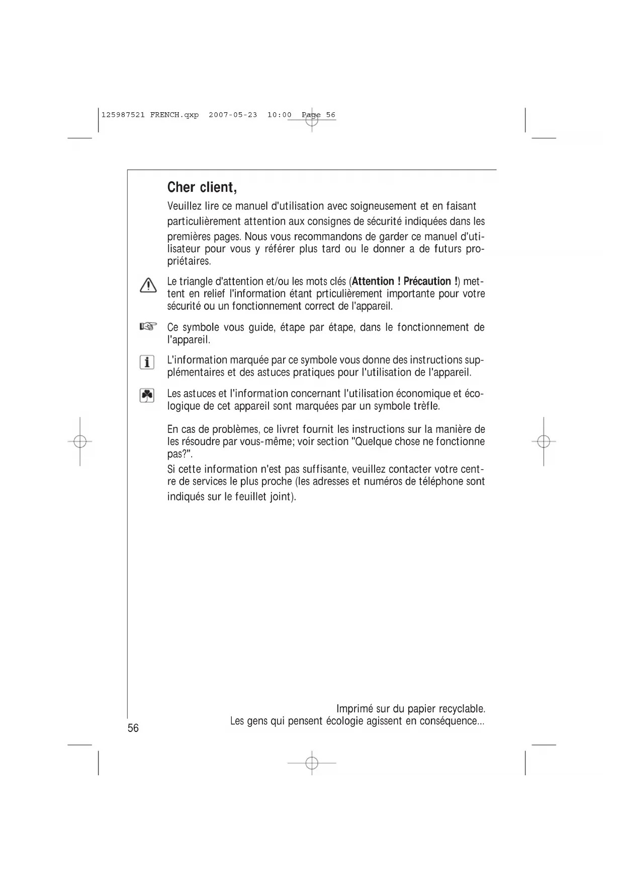 - Bergensesteenweg, 719 - B-1502 LEMBEEK Tel.: 02.363.04.44 125987521 GERMAN.qxp 2007-05-23 09:45 Page 5556 Cher client, Veuillez lire ce manuel d'utilisation avec soigneusement et en faisant particulièrement attention aux consignes de sécurité indiquées dans les premières pages. Nous vous recommandons de garder ce manuel d'uti- lisateur pour vous y référer plus tard ou le donner a de futurs pro- priétaires. Le triangle d'attention et/ou les mots clés (Attention ! Précaution !) met- tent en relief l'information étant prticulièrement importante pour votre sécurité ou un fonctionnement correct de l'appareil. Ce symbole vous guide, étape par étape, dans le fonctionnement de l'appareil. L'information marquée par ce symbole vous donne des instructions sup- plémentaires et des astuces pratiques pour l'utilisation de l'appareil. Les astuces et l'information concernant l'utilisation économique et éco- logique de cet appareil sont marquées par un symbole trèfle. En cas de problèmes, ce livret fournit les instructions sur la manière de les résoudre par vous-même; voir section "Quelque chose ne fonctionne pas?". Si cette information n'est pas suffisante, veuillez contacter votre cent- re de services le plus proche (les adresses et numéros de téléphone sont indiqués sur le feuillet joint). Imprimé sur du papier recyclable. Les gens qui pensent écologie agissent en conséquence… 125987521 FRENCH.qxp 2007-05-23 10:00 Page 5657 Contenus Consignes de sécurité p. 58