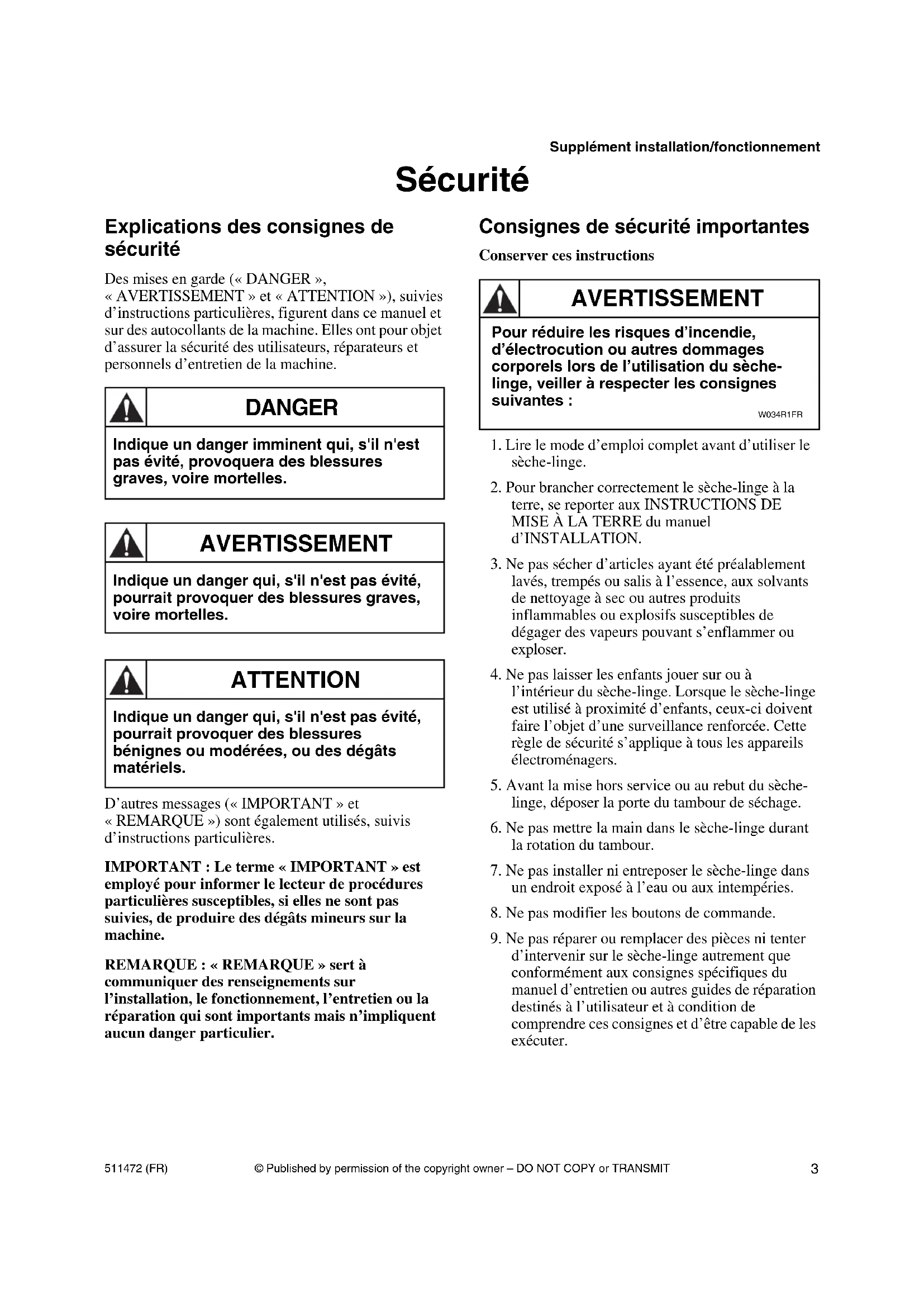 d’intervenir sur le sèche-linge autrement que conformément aux consignes spécifiques du manuel d’entretien ou autres guides de réparation destinés à l’utilisateur et à condition de comprendre ces consignes et d’être capable de les exécuter. Indique un danger imminent qui, s'il n'est pas évité, provoquera des blessures graves, voire mortelles. DANGER Indique un danger qui, s'il n'est pas évité, pourrait provoquer des blessures graves, voire mortelles. AVERTISSEMENT Indique un danger qui, s'il n'est pas évité, pourrait provoquer des blessures bénignes ou modérées, ou des dégâts matériels. ATTENTION Pour réduire les risques d’incendie, d’électrocution ou autres dommages corporels lors de l’utilisation du sèche- linge, veiller à respecter les consignes suivantes : W034R1FR AVERTISSEMENT© Published by permission of the copyright owner – DO NOT COPY or TRANSMIT Supplément installation/fonctionnement 511472 (FR)