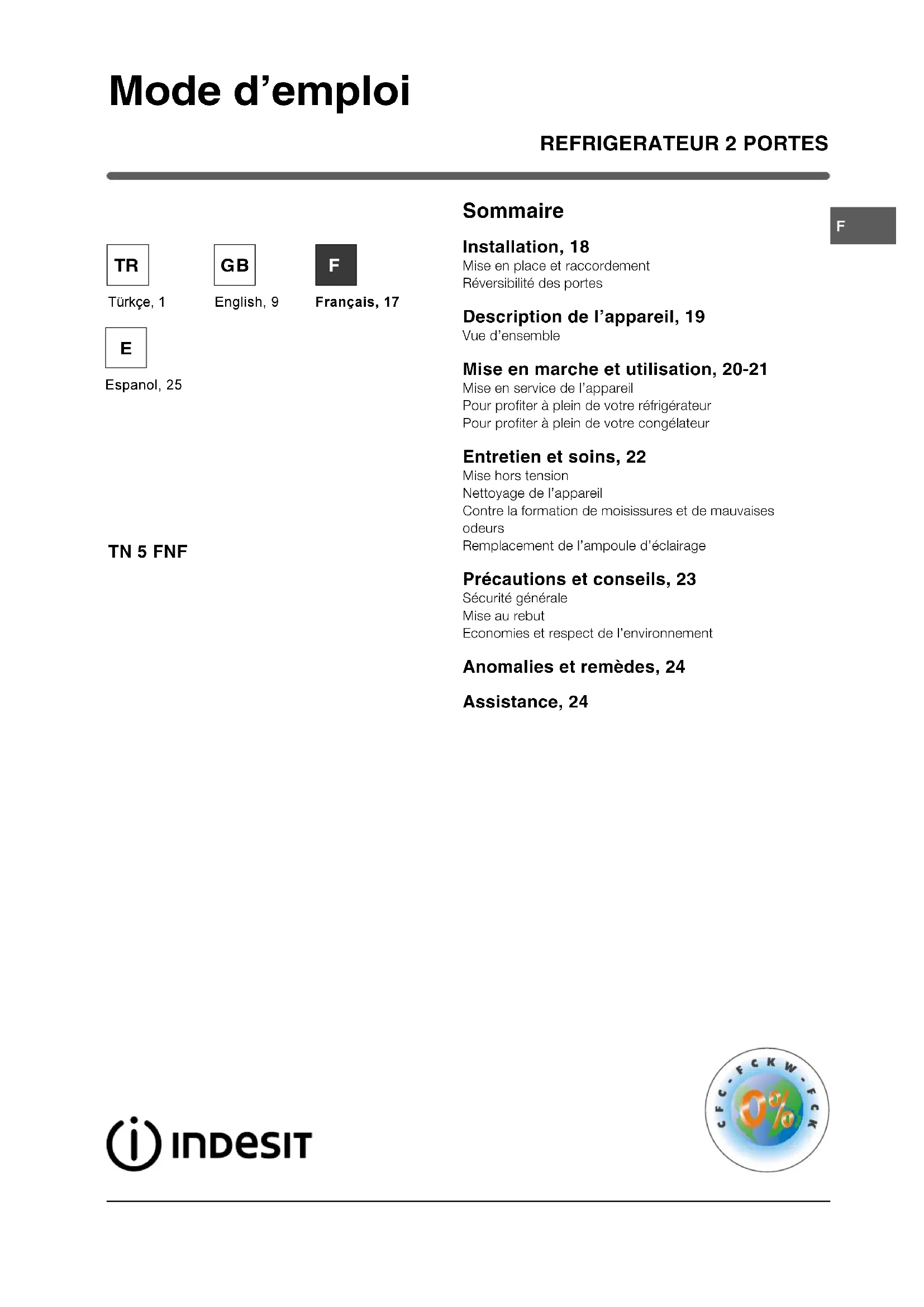 MODE D'EMPLOI TN 5 FNF INDESIT