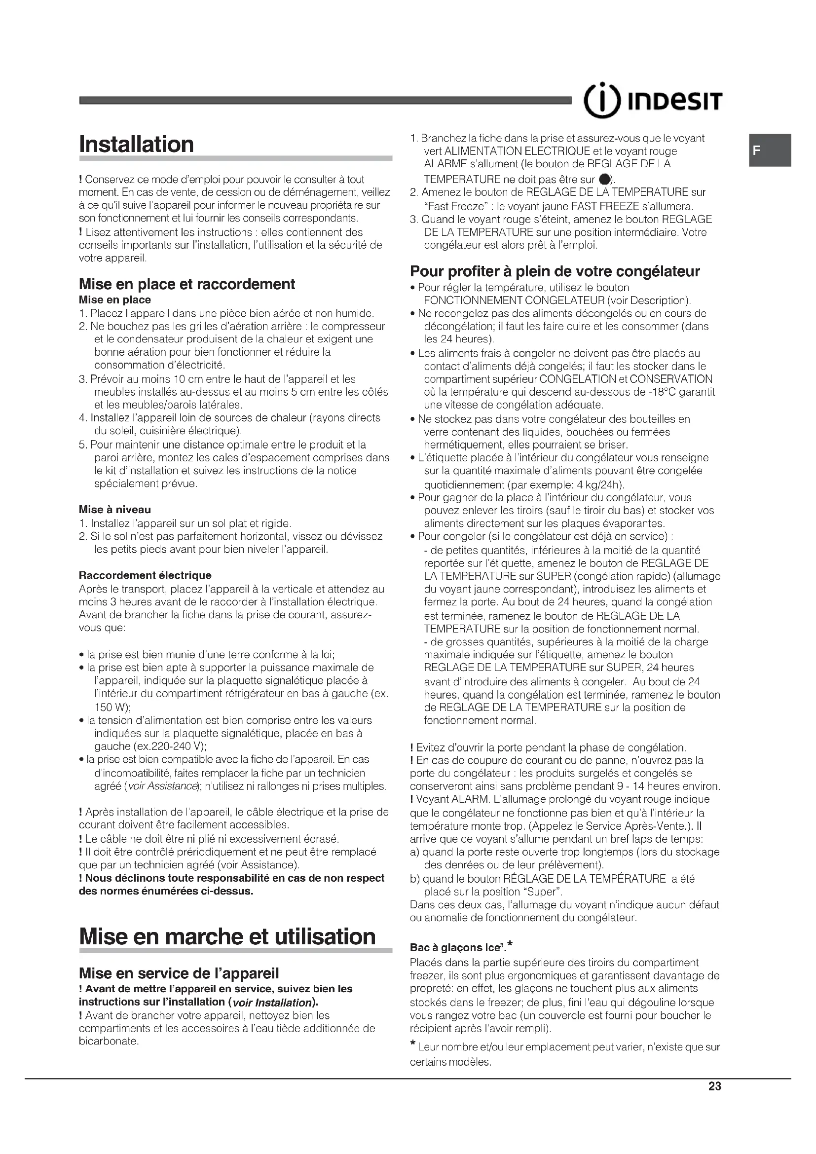 ! Avant de brancher votre appareil, nettoyez bien lescompartiments et les accessoires à l’eau tiède additionnée debicarbonate.1. Branchez la fiche dans la prise et assurez-vous que le voyantvert ALIMENTATION ELECTRIQUE et le voyant rougeALARME s’allument (le bouton de REGLAGE DE LATEMPERATURE ne doit pas être sur 2. Amenez le bouton de REGLAGE DE LA TEMPERATURE sur“Fast Freeze” : le voyant jaune FAST FREEZE s’allumera.3. Quand le voyant rouge s’éteint, amenez le bouton REGLAGEDE LA TEMPERATURE sur une position intermédiaire. Votrecongélateur est alors prêt à l’emploi. Pour profiter à plein de votre congélateur
