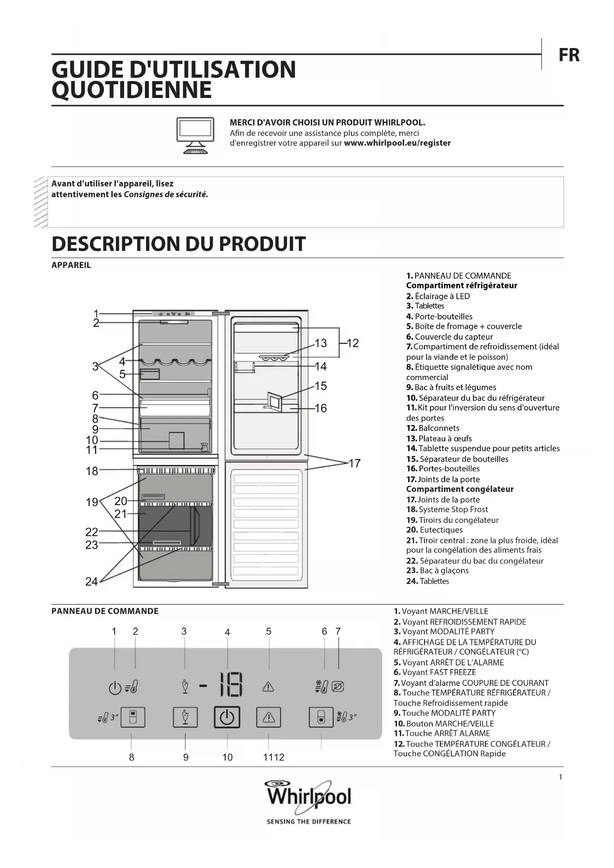 1. Voyant MARCHE/VEILLE 2. Voyant REFROIDISSEMENT RAPIDE3. Voyant MODALITÉ PARTY4. AFFICHAGE DE LA TEMPÉRATURE DU RÉFRIGÉRATEUR / CONGÉLATEUR (°C) 5. Voyant ARRÊT DE L’ALARME6. Voyant FAST FREEZE7. Voyant d’alarme COUPURE DE COURANT8. Touche TEMPÉRATURE RÉFRIGÉRATEUR / Touche Refroidissement rapide9. Touche MODALITÉ PARTY10. Bouton MARCHE/VEILLE11. Touche ARRÊT ALARME12. Touche TEMPÉRATURE CONGÉLATEUR / Touche CONGÉLATION RapidePANNEAU DE COMMANDE1. PANNEAU DE COMMANDECompartiment réfrigérateur2. Éclairage à LED3. Tablettes 4. Porte-bouteilles5. Boîte de fromage + couvercle6. Couvercle du capteur7. Compartiment de refroidissement (idéal pour la viande et le poisson)8. Étiquette signalétique avec nom commercial9. Bac à fruits et légumes10. Séparateur du bac du réfrigérateur11. Kit pour l'inversion du sens d'ouverture des portes12. Balconnets13. Plateau à œufs14. Tablette suspendue pour petits articles15. Séparateur de bouteilles16. Portes-bouteilles17. Joints de la porteCompartiment congélateur17. Joints de la porte18. Systeme Stop Frost19. Tiroirs du congélateur20. Eutectiques21. Tiroir central : zone la plus froide, idéal pour la congélation des aliments frais22. Séparateur du bac du congélateur23. Bac à glaçons24. TablettesAvant d’utiliser l’appareil, lisez attentivement les Consignes de sécurité. GUIDE D'UTILISATION QUOTIDIENNE