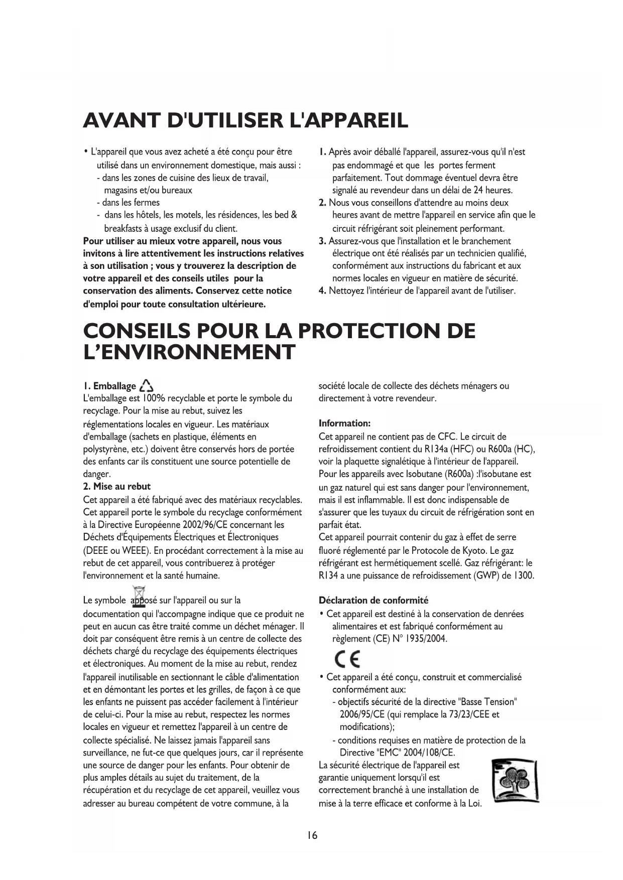 - Cet appareil est destiné à la conservation de denrées alimentaires et est fabriqué conformément au règlement (CE) N° 1935/2004.