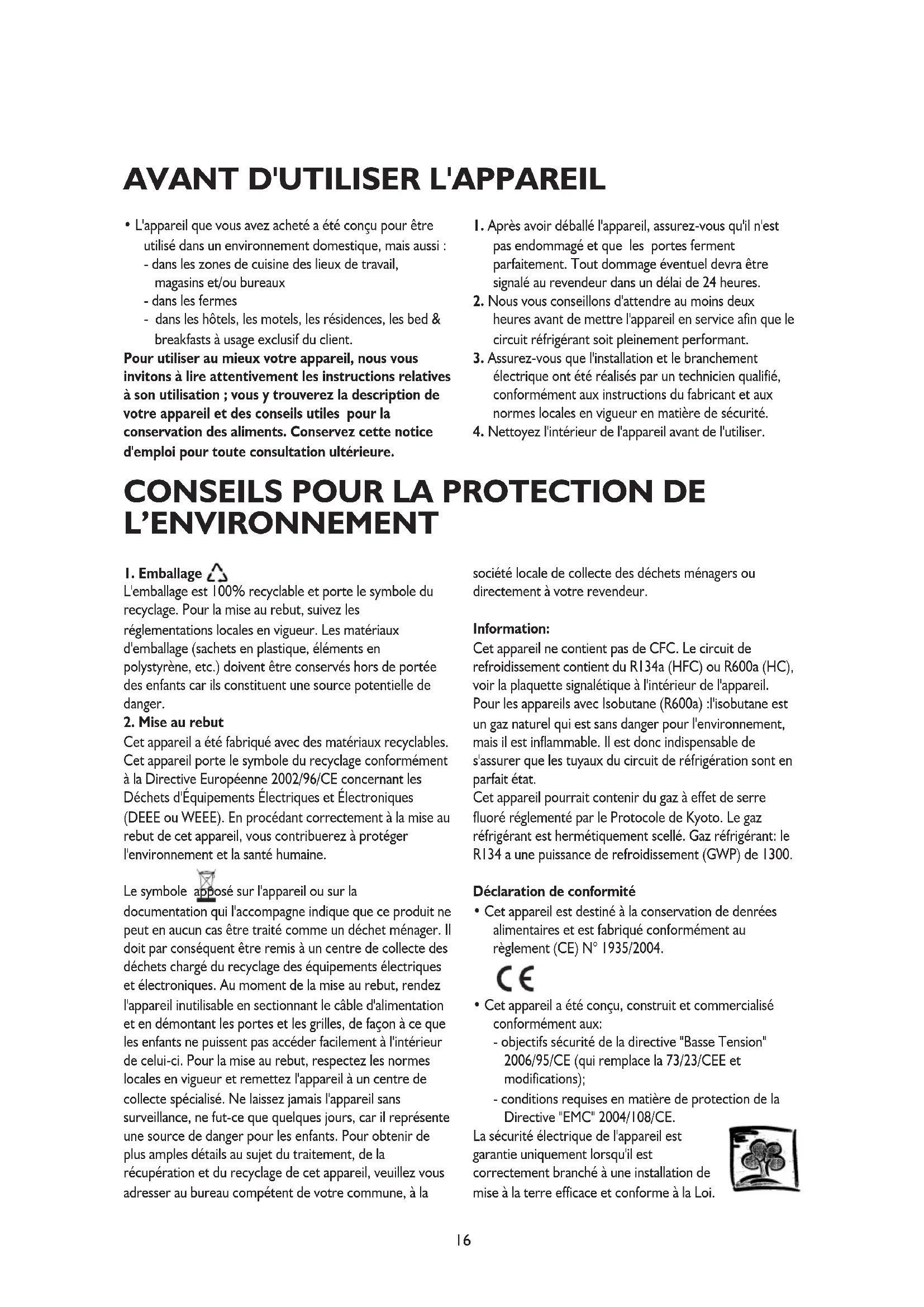 - Cet appareil est destiné à la conservation de denrées alimentaires et est fabriqué conformément au règlement (CE) N° 1935/2004.