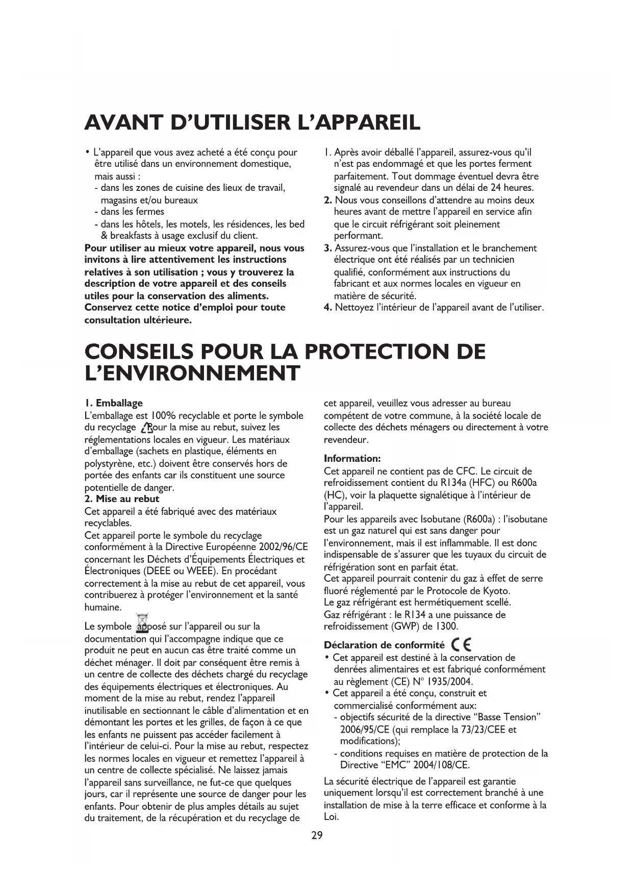 Cet appareil a été fabriqué avec des matériaux recyclables. Cet appareil porte le symbole du recyclage conformément à la Directive Européenne 2002/96/CE concernant les Déchets d’Équipements Électriques et Électroniques (DEEE ou WEEE). En procédant correctement à la mise au rebut de cet appareil, vous contribuerez à protéger l’environnement et la santé humaine. Le symbole apposé sur l’appareil ou sur la documentation qui l’accompagne indique que ce produit ne peut en aucun cas être traité comme un déchet ménager. Il doit par conséquent être remis à un centre de collecte des déchets chargé du recyclage des équipements électriques et électroniques. Au moment de la mise au rebut, rendez l’appareil inutilisable en sectionnant le câble d’alimentation et en démontant les portes et les grilles, de façon à ce que les enfants ne puissent pas accéder facilement à l’intérieur de celui-ci. Pour la mise au rebut, respectez les normes locales en vigueur et remettez l’appareil à un centre de collecte spécialisé. Ne laissez jamais l’appareil sans surveillance, ne fut-ce que quelques jours, car il représente une source de danger pour les enfants. Pour obtenir de plus amples détails au sujet du traitement, de la récupération et du recyclage de cet appareil, veuillez vous adresser au bureau compétent de votre commune, à la société locale de collecte des déchets ménagers ou directement à votre revendeur. Information: Cet appareil ne contient pas de CFC. Le circuit de refroidissement contient du R134a (HFC) ou R600a (HC), voir la plaquette signalétique à l’intérieur de l’appareil. Pour les appareils avec Isobutane (R600a) : l’isobutane est un gaz naturel qui est sans danger pour l’environnement, mais il est inflammable. Il est donc indispensable de s’assurer que les tuyaux du circuit de réfrigération sont en parfait état. Cet appareil pourrait contenir du gaz à effet de serre fluoré réglementé par le Protocole de Kyoto. Le gaz réfrigérant est hermétiquement scellé. Gaz réfrigérant : le R134 a une puissance de refroidissement (GWP) de 1300. Déclaration de conformité