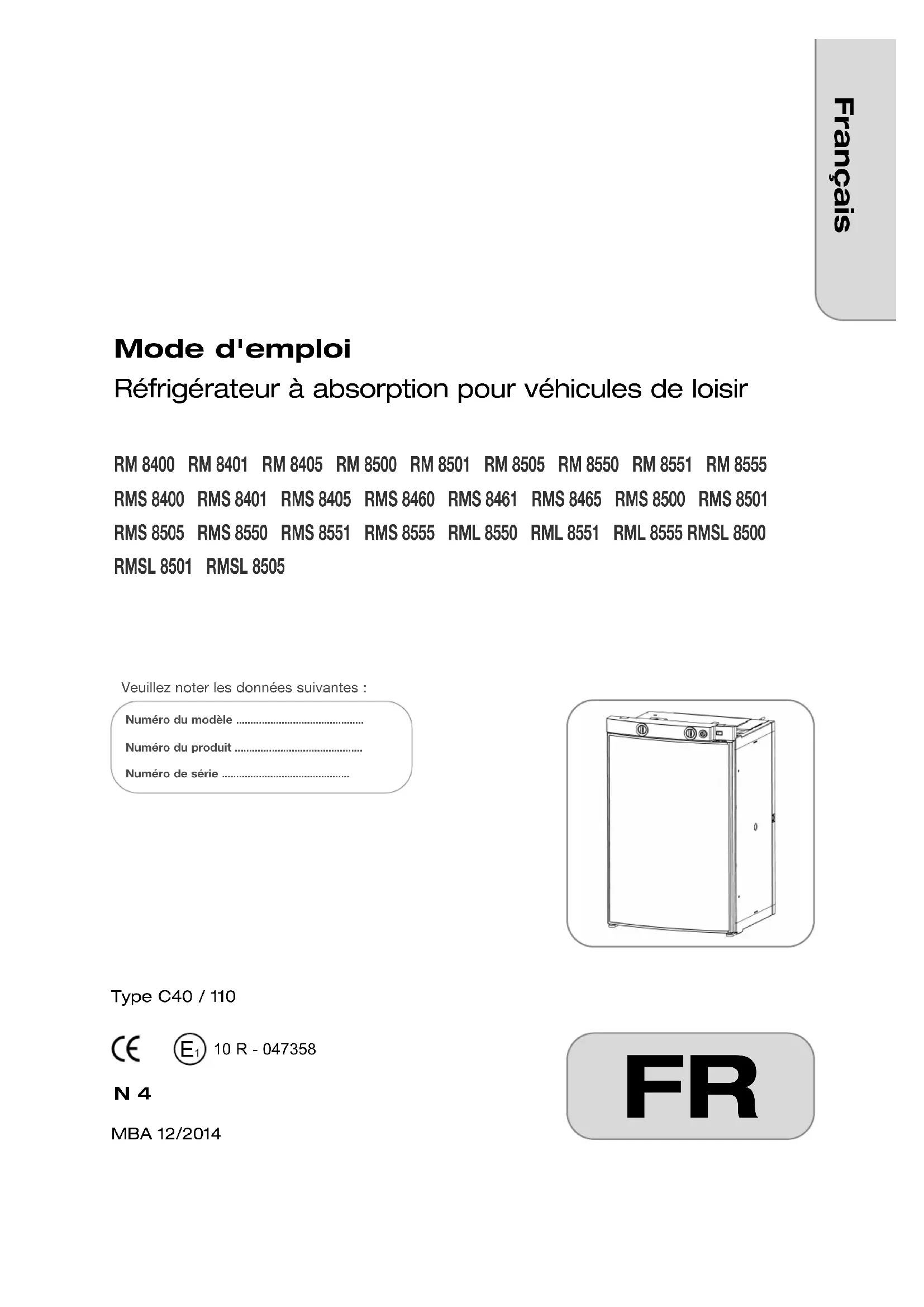Français Mode d'emploi Réfrigérateur à absorption pour véhicules de loisir N 4 MBA 12/2014Type C40 / 11010 R - 047358 289 0317-01_FR_RMx8xxx-Bedienung_N4_Layout 1 10.12.2014 17:11 Seite 12 Pour votre sécurité AVERTISSEMENT ! Cet appareil peut être utilisé par les enfants âgés de plus de 8 ans et par les personnes à aptitudes physiques, senso- rielles ou mentales réduites ou manquant d'expérience et/ou de connaissances, si celles-ci sont surveillées ou ont été instruites sur l'utilisation sans risques de l'appareil et si celles-ci sont conscientes des dangers potentiels. Cet appareil ne doit pas être utilisé comme jeu par les enfants. Le nettoyage et l'entretien ne doivent pas être effectués par les enfants. AVERTISSEMENT ! Ne contrôlez jamais les défauts d'étan- chéité des pièces et conduites d'amenée du gaz à côté d'une flamme! Danger d'incendie ou d'explosion ! DANGER ! Il est interdit d'utiliser l'appareil avec du gaz n dans les stations-service n sur les transbordeurs et sur les trains autos accompagnées n lors du transport de la caravane/du camping-car avec un véhicule de trans port ou de dépannage. Risque d'incendie ! Débranchez l'appareil. La pression de service du réducteur de pression sur l'installation de gaz doit absolument correspondre aux spécificati- ons de la plaque signalétique du réfrigéra- teur. En cas d'écarts de valeurs, l'appareil peut être endommagé et provoquer un état de danger. Le réfrigérateur n'a pas été conçu pour la conservation professionnelle de médica- ments. Veuillez tenir compte des indicati- ons figurant sur la notice d'emballage du médicament. Quittez la pièce immédiatement si vous sentez de l'ammoniaque. Débranchez auparavant l'appareil. Ne jamais ouvrir le groupe frigorifique à absorption! Il est sous haute pression. Risque de blessures ! Seule une personne habilitée est autori- sée à effectuer des travaux sur les instal- lations électriques et de gaz, ainsi que sur le système d'évacuation du gaz. Les mesures non appropriées peuvent causer des dommages aux personnes et des dégâts matériels considérables. 289 0317-01_FR_RMx8xxx-Bedienung_N4_Layout 1 10.12.2014 17:11 Seite 23 ATTENTION! AVERTISSEMENT ! Remplacez les batteries : n Retirez les batteries déchargées. n Remplacez toutes les batteries. n Ne pas utiliser des types de batterie diverses. n Tenir compte de la polarité ! n Ne pas raccorder les batteries non rechargeables à un chargeur de batte- rie. n Retirer les batteries rechargeables (accu) du compartiment à batteries avant de recharger. n Eviter les courts-circuits sur les con- tacts dans le compartiment à batteries! n Retirer les batteries du compartiment à batteries en cas de mise hors-service prolongée du réfrigérateur. Mode 230V CA: Ne sélectionner ce type de fonctionne- ment que si le voltage de la prise corre- spond valeur indiquée sur l'appareil. Risque de dommages si les valeurs sont différentes! Dégivrage Ne jamais enlever la couche de givre en utilisant la force, ni accélérer le dégivrage en utilisant une source de chaleur ! Nettoyage du véhicule: Il est impératif de fermer et verrouiller la porte du réfrigérateur avant le démarrage du véhicule ! Le groupe frigorifique en service devient très chaud. Protégez-vous avant de tou- cher aux pièces conductrices de chaleur lorsque les grilles d'aération sont enle- vées ! Si la ligne de branchement est endomma- gée, celle-ci doit être remplacée par le service clientèle de Dometic ou tout autre personnel également qualifié afin d'éviter les éventuels dangers. ATTENTION! Protéger les enfants: Lors de la mise au rebut du réfrigérateur, démontez toutes les portes et laissez les clayettes dans l'appareil. Tout risque d'enfermement ou d'asphyxie pourra ainsi être évité. Préparation des glaçons: Utiliser uniquement de l'eau potable ! 289 0317-01_FR_RMx8xxx-Bedienung_N4_Layout 1 10.12.2014 17:11 Seite 34