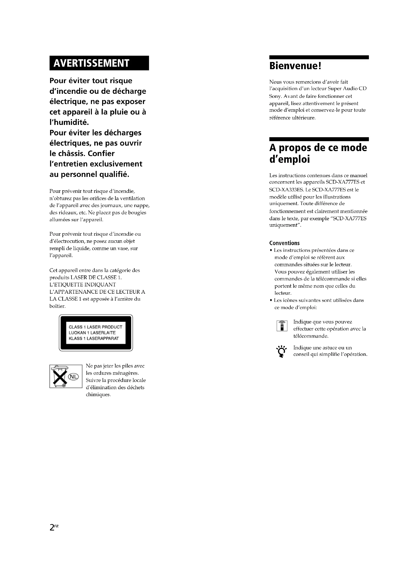 LA CLASSE 1 est apposée à l’arrière du boîtier. Bienvenue! Nous vous remercions d’avoir fait l’acquisition d’un lecteur Super Audio CD Sony. Avant de faire fonctionner cet appareil, lisez attentivement le présent mode d’emploi et conservez-le pour toute référence ultérieure. A propos de ce mode d’emploi Les instructions contenues dans ce manuel concernent les appareils SCD-XA777ES et SCD-XA333ES. Le SCD-XA777ES est le modèle utilisé pour les illustrations uniquement. Toute différence de fonctionnement est clairement mentionnée dans le texte, par exemple “SCD-XA777ES uniquement”. Conventions
