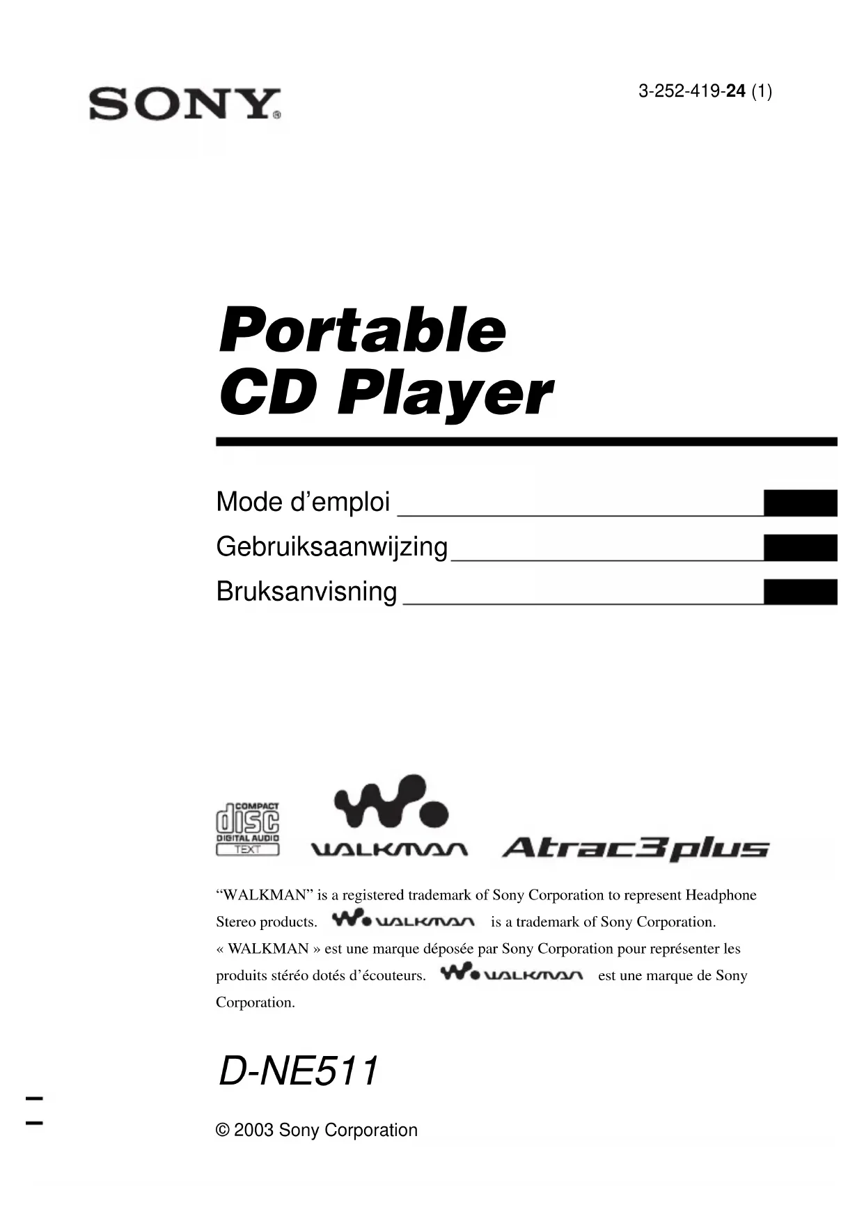© 2003 Sony Corporation Portable CD Player 3-252-419-24 (1) D-NE511 “WALKMAN” is a registered trademark of Sony Corporation to represent HeadphoneStereo products.is a trademark of Sony Corporation. «WALKMAN » est une marque déposée par Sony Corporation pour représenter les produits stéréo dotés d’écouteurs.est une marque de SonyCorporation. Mode d’emploi FR Gebruiksaanwijzing NL Bruksanvisning SE2-FR ATRAC3plus et ATRAC3 sont des marques de Sony Corporation. AVERTISSEMENT Pour prévenir tout risque d’incendie ou d’électrocution, ne pas exposer l’appareil à la pluie ou à l’humidité. N’installez pas l’appareil dans un espace confiné comme dans une bibliothèque ou un meuble encastré. Afin d’éviter tout risque d’incendie, ne pas couvrir les ailettes de ventilation de cet appareil avec des journaux, des nappes, des rideaux, etc. Ne pas poser de bougies allumées sur l’appareil. Afin d’éviter tout risque d’incendie et d’électrocution, ne pas poser d’objets remplis de liquide, vases ou autre, sur l’appareil. INFORMATION A pleine puissance, l’écoute prolongée du baladeur peut endommager l’oreille de l’utilisateur. ATTENTION L’utilisation d’instruments optiques avec ce produit augmente les risques pour les yeux. Certains pays peuvent appliquer des dispositions différentes pour l’élimination des piles qui alimentent ce produit. Veuillez consulter vos autorités locales. PRECAUTIONS