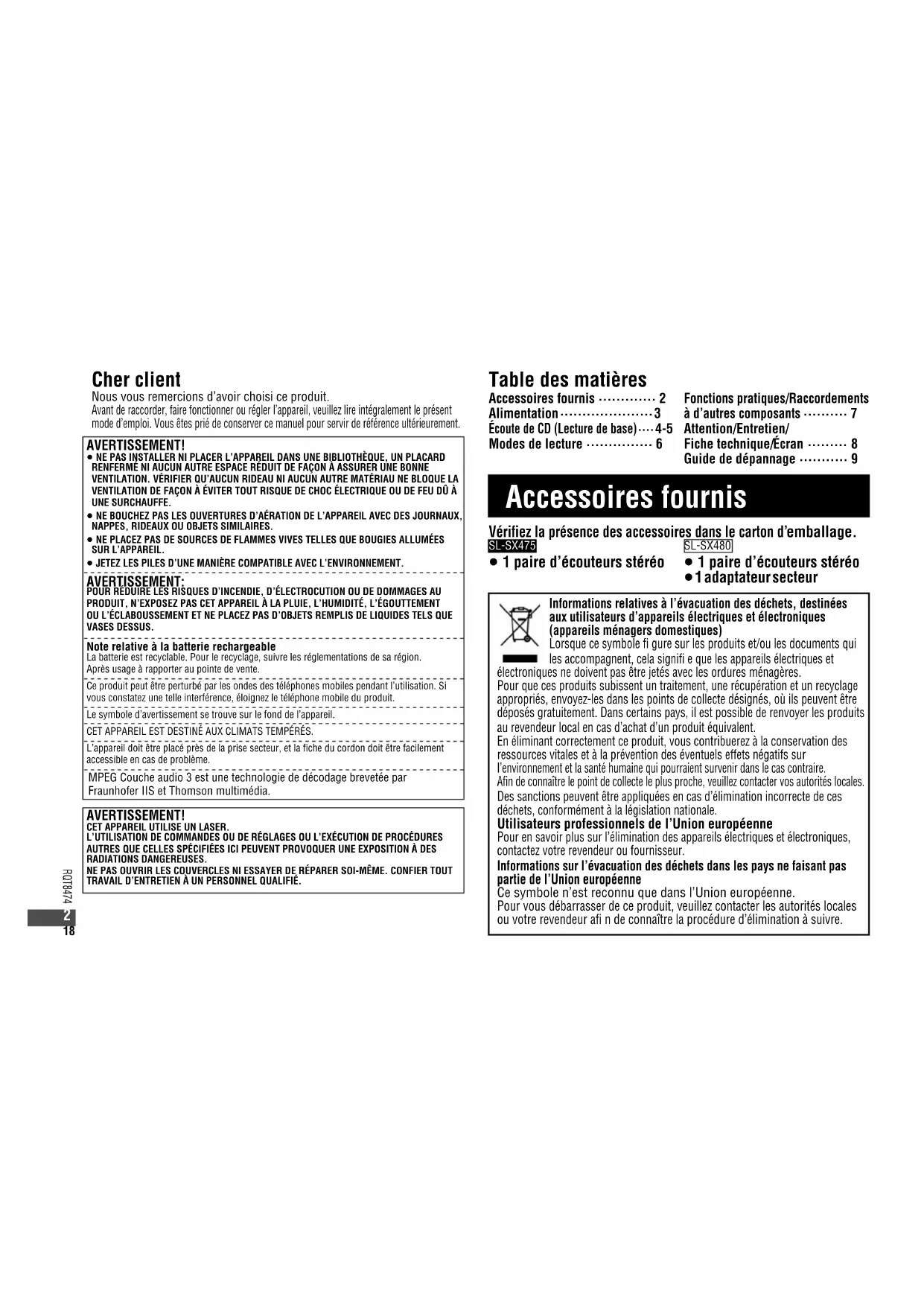 taliano RQT8474-EItalian.indd17RQT8474-EItalian.indd17 2005/11/079:55:372005/11/079:55:3718 RQT8474 Accessoires fournis Cher client Nous vous remercions d’avoir choisi ce produit.Avant de raccorder, faire fonctionner ou régler l’appareil, veuillez lire intégralement le présent mode d’emploi. Vous êtes prié de conserver ce manuel pour servir de référence ultérieurement. Vérifiez la présence des accessoires dans le carton d’ emballage. SL-SX475 p 1 paire d’écouteurs stéréo SL-SX480