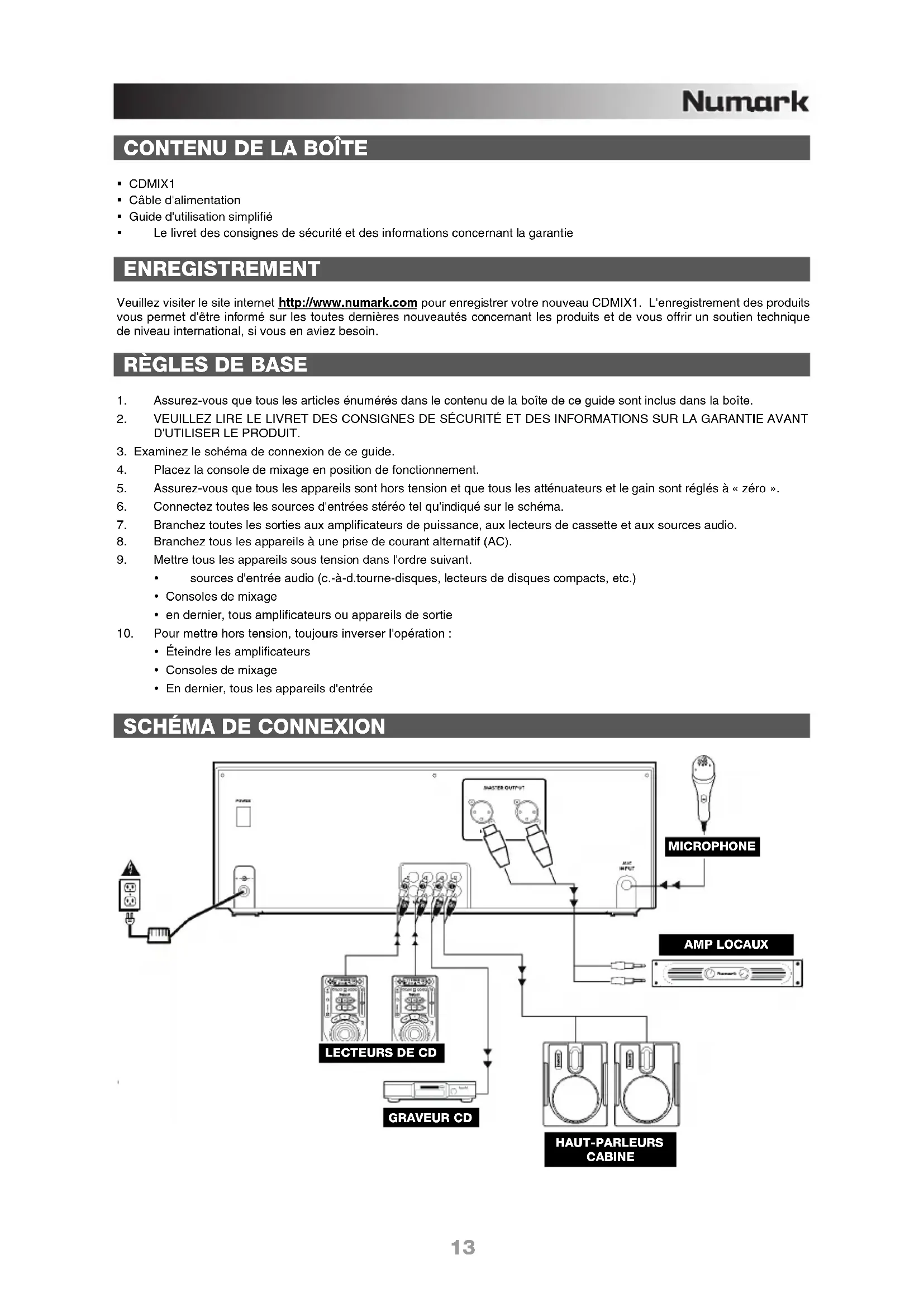 CDMIX1 Câble d'alimentation Guide d'utilisation simplifié Le livret des consignes de sécurité et des informations concernant la garantie ENREGISTREMENT Veuillez visiter le site internet http://www.numark.com pour enregistrer votre nouveau CDMIX1. L'enregistrement des produits vous permet d'être informé sur les toutes dernières nouveautés concernant les produits et de vous offrir un soutien technique de niveau international, si vous en aviez besoin.