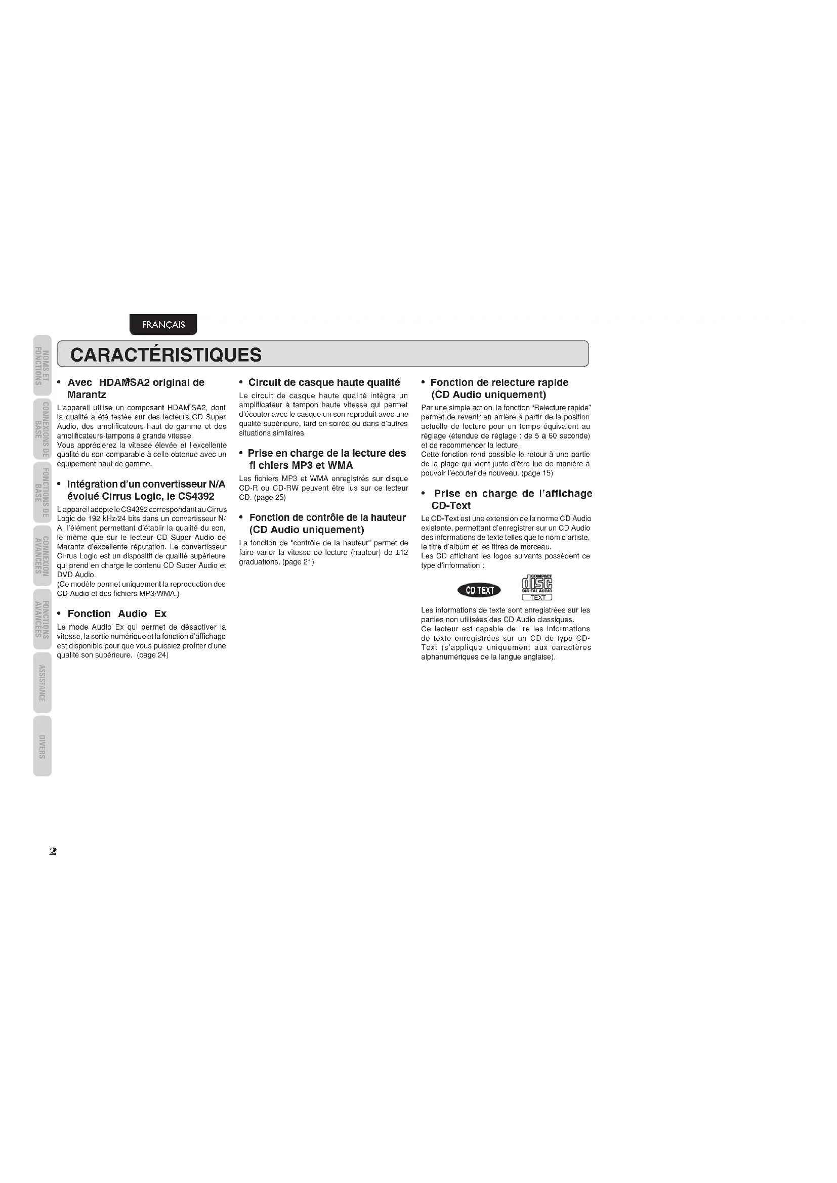 - Sur l'une des faces du “DualDisc" sont enregistrés les signaux vidéo et audio conformes aux normes DVD et sur l'autre face sont enregistrés les signaux audio lisibles sur un lecteur CD. • Les signaux enregistrés sur la face comprenant les signaux audio uniquement (la face CD) ne sont pas conformes aux normes physiques générales concernant les CD et ils pourraient être illisibles sur ce lecteur. • Pour d'ultérieurs détails concernant les spécifications et les normes “DualDisc", veuillez contacter votre revendeur ou votre distributeur de disques. CD5003U02FRA.indd33CD5003U02FRA.indd33 08.6.198:24:11AM08.6.198:24:11AM34 FRANÇAIS CONNEXIONS DE BASE FONCTIONS DE BASE CONNEXION AVANCEES FONCTIONS AVANCÉES ASSISTANCE NOMS ET FONCTIONS DIVERSDIVERS DIVERS Ce chapitre décrit les tâches d’entretien à réaliser pour optimiser le fonctionnement de votre matériel Marantz.