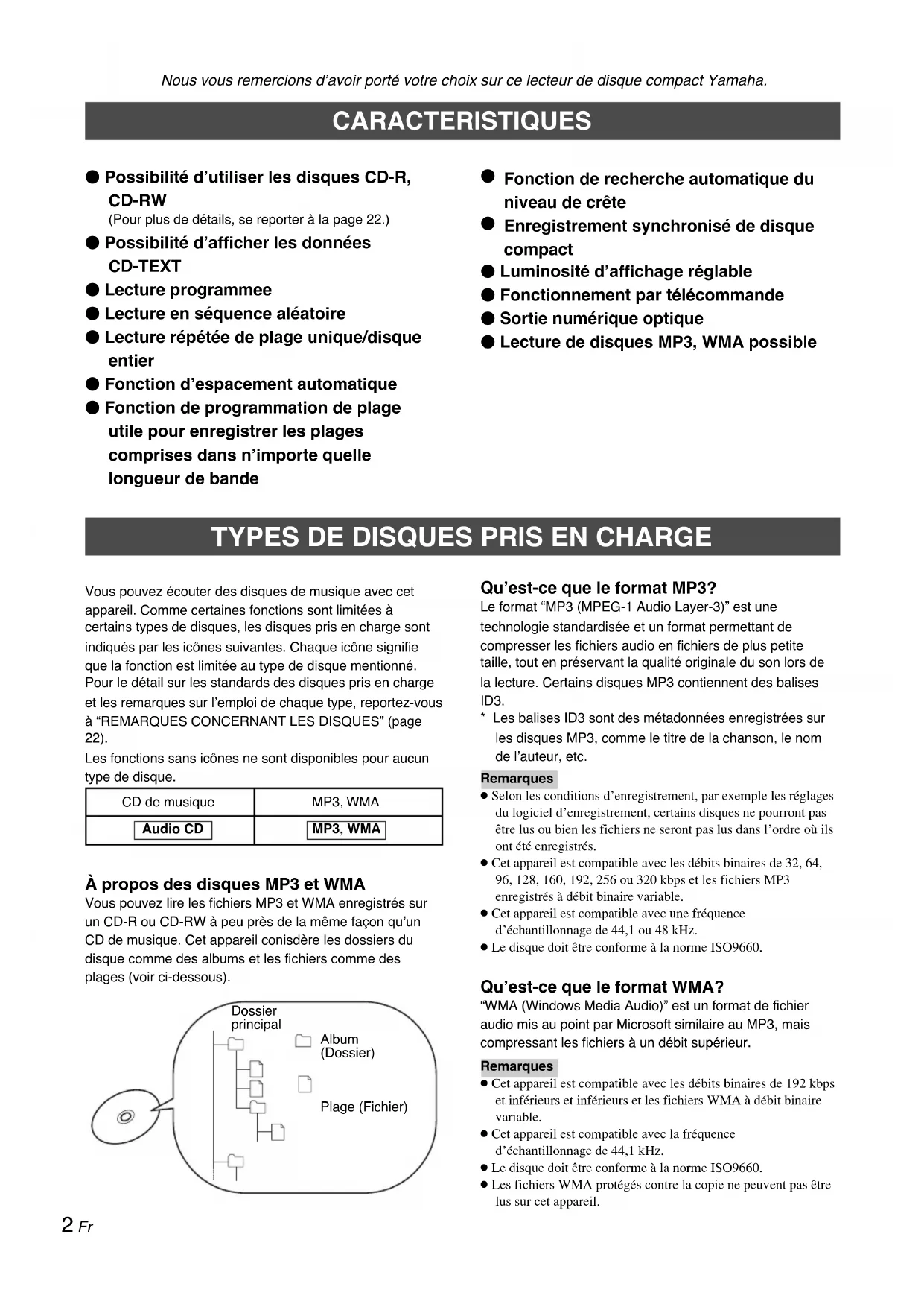 CD de musique À propos des disques MP3 et WMA Vous pouvez lire les fichiers MP3 et WMA enregistrés surun CD-R ou CD-RW à peu près de la même façon qu’unCD de musique. Cet appareil conisdère les dossiers dudisque comme des albums et les fichiers comme desplages (voir ci-dessous).DossierprincipalPlage (Fichier)Album(Dossier)MP3, WMAAudio CD Nous vous remercions d’avoir porté votre choix sur ce lecteur de disque compact Yamaha. CARACTERISTIQUES MP3, WMA 䢇 Possibilité d’utiliser les disques CD-R, CD-RW (Pour plus de détails, se reporter à la page 22.) 䢇 Possibilité d’afficher les données CD-TEXT 䢇 Lecture programmee 䢇 Lecture en séquence aléatoire 䢇 Lecture répétée de plage unique/disque entier 䢇 Fonction d’espacement automatique 䢇 Fonction de programmation de plage utile pour enregistrer les plages comprises dans n’importe quelle longueur de bande 02Fr_02_BOD_CDX-397MK2_G.p65 29/1/07, 1:34 PM23