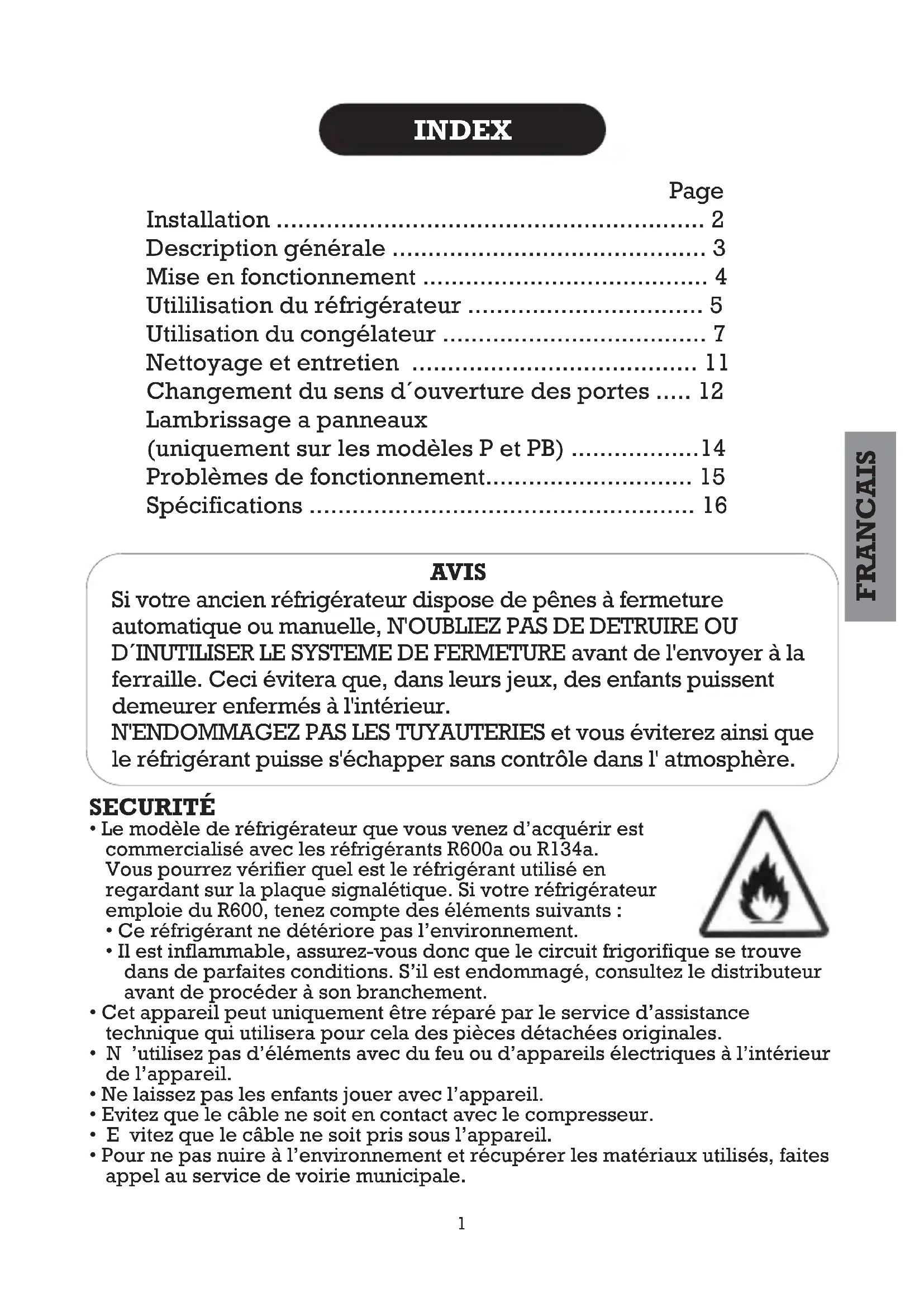 - Spécifications Si votre ancien réfrigérateur dispose de pênes à fermeture automatique ou manuelle, N'OUBLIEZ PAS DE DETRUIRE OU D´INUTILISER LE SYSTEME DE FERMETURE avant de l'envoyer à la ferraille. Ceci évitera que, dans leurs jeux, des enfants puissent demeurer enfermés à l'intérieur. N'ENDOMMAGEZ PAS LES TUYAUTERIES et vous éviterez ainsi que le réfrigérant puisse s'échapper sans contrôle dans l' atmosphère. AVIS SECURITÉ p. 16