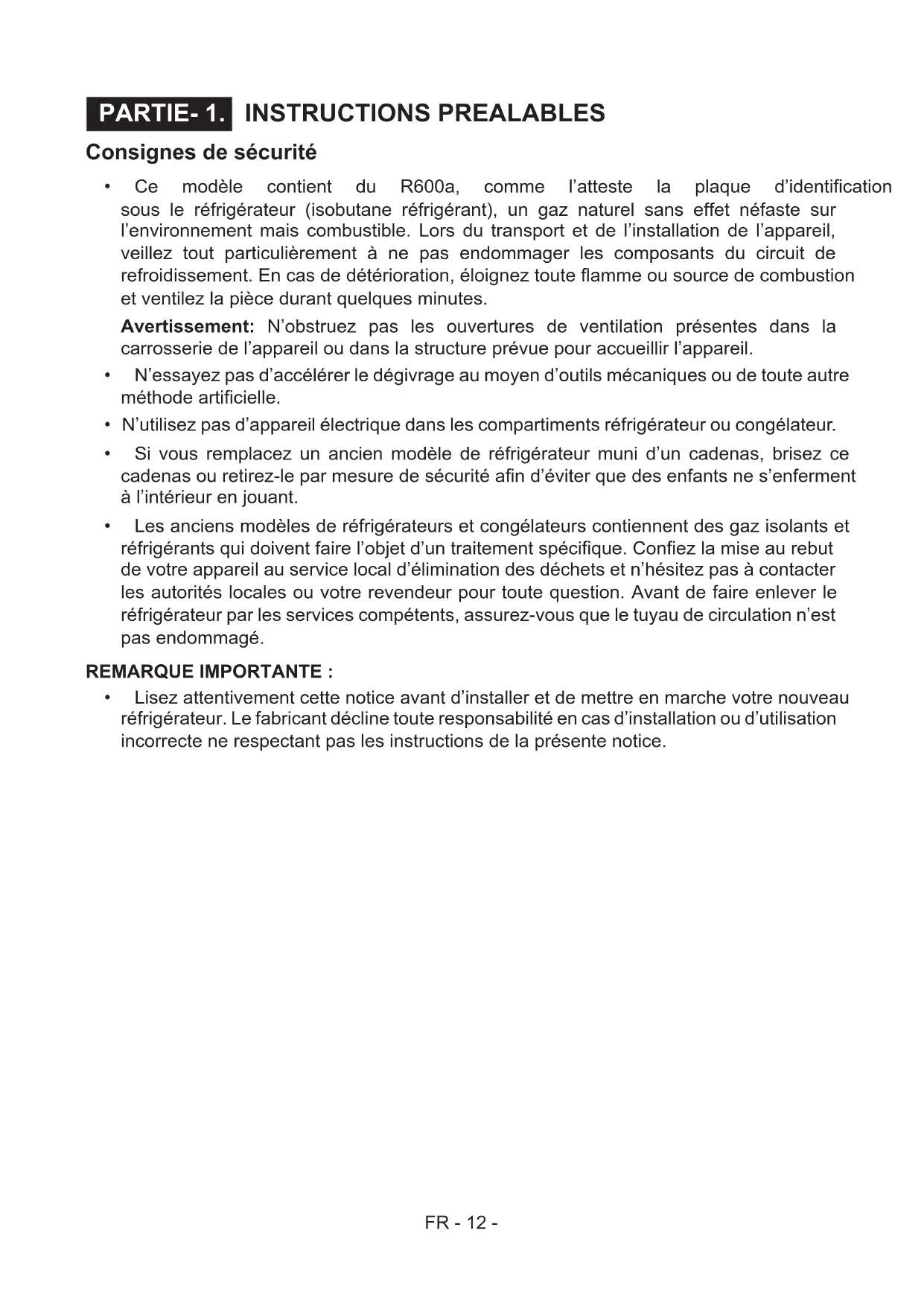 - Lisez attentivement cette notice avant d’installer et de mettre en marche votre nouveau réfrigérateur. Le fabricant décline toute responsabilité en cas d’installation ou d’utilisation incorrecte ne respectant pas les instructions de la présente notice.FR - 13 - Recommandations ! Avertissement: N’utilisez pas d’appareils mécaniques ou d’autres moyens articiels pour accélérer le processus de décongélation. N’utilisez pas d’appareils électriques dans l’espace de stockage des aliments de l’appareil. N’obstruez pas les ouvertures de ventilation de l’appareil. N’endommagez pas le circuit de liquide réfrigérant du réfrigérateur.