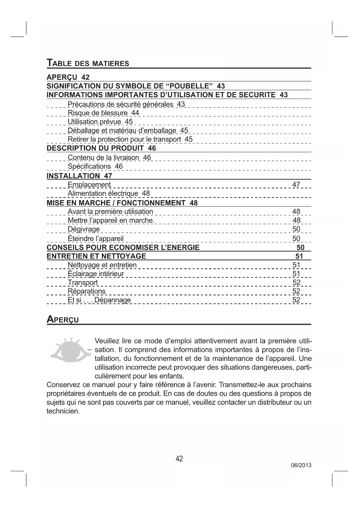 aBle Des Matieres aPerÇU 42 siGniFicatiOn DU sYMBOle De “POUBelle” 43 inFOrMatiOns iMPOrtantes D’UtilisatiOn et De secUrite 43 Précautions de sécurité générales 43 Risque de blessure 44 Utilisation prévue 45 Déballage et matériau d’emballage 45 Retirer la protection pour le transport 45 DescriPtiOn DU PrODUit 46 Contenu de la livraison 46 Spécications 46 installatiOn 47 Emplacement 47 Alimentation électrique 48 Mise en Marche / FOnctiOnneMent 48 Avant la première utilisation 48 Mettre l’appareil en marche. 48 Dégivrage 50 Éteindre l’appareil 50 cOnseils POUr ecOnOMiser l’enerGie 50 entretien et nettOYaGe 51 Nettoyage et entretien 51 Éclairage intérieur 51 Transport 52 Réparations 52 Et si . . . Dépannage 52