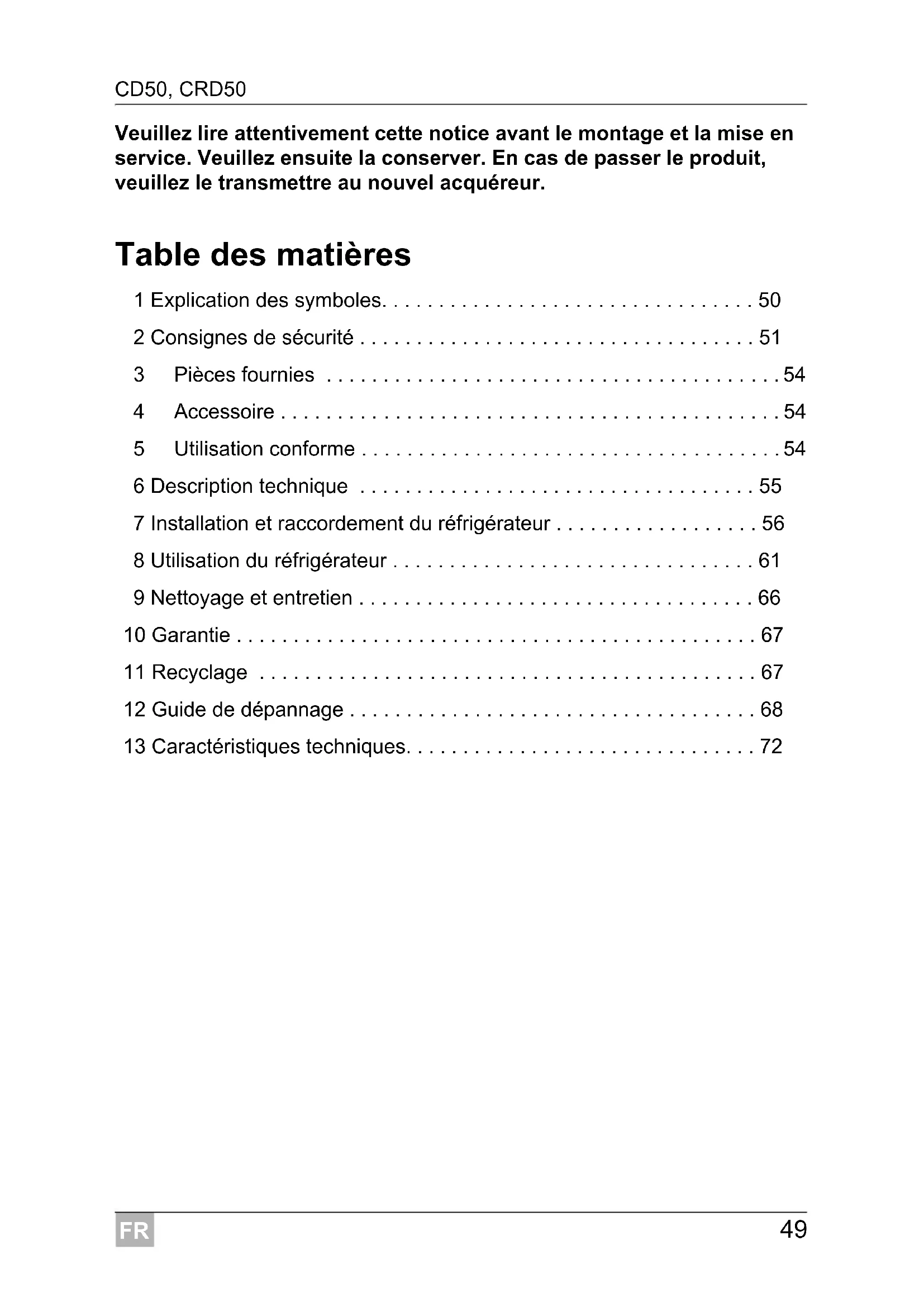 Lorsque vous mettrez votre produit définitivement hors service, informez-vous auprès du centre de recyclage le plus proche ou auprès de votre revendeur spécialisé sur les prescriptions relatives au retraitement des déchets. AVERTISSEMENT ! Risque d'enfermement pour les enfants ! Avant de mettre au rebut votre ancien réfrigérateur : démontez le tiroir. Laissez les clayettes dans le réfrigérateur, afin que les enfants ne puissent pas entrer dedans.FR Guide de dépannage CD50, CRD50