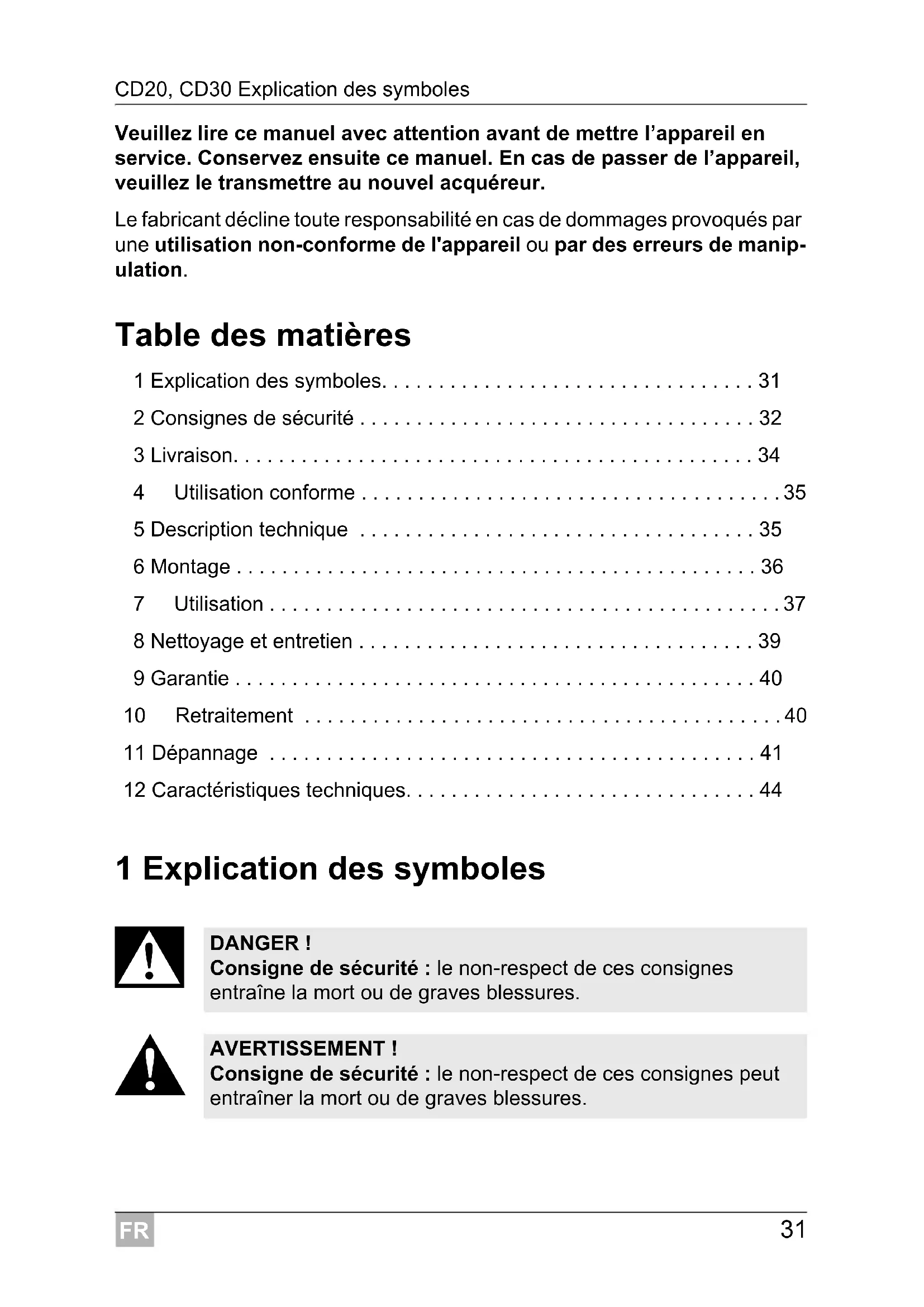 DANGER ! Consigne de sécurité : le non-respect de ces consignes entraîne la mort ou de graves blessures. AVERTISSEMENT ! Consigne de sécurité : le non-respect de ces consignes peut entraîner la mort ou de graves blessures.FR Consignes de sécurité CD20, CD30
