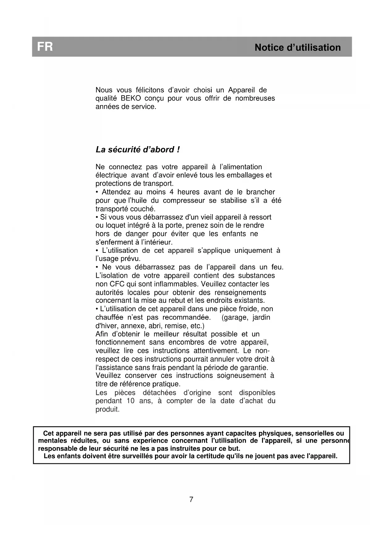 Cet appareil ne sera pas utilisé par des personnes ayant capacites physiques, sensorielles ou mentales réduites, ou sans experience concernant l'utilisation de l'appareil, si une personne responsable de leur sécurité ne les a pas instruites pour ce but. Les enfants doivent être surveillés pour avoir la certitude qu'ils ne jouent pas avec l'appareil.FR Notice d’utilisation Conditions électriques Avant de brancher l'appareil à la prise murale, vérifiez que la tension et la fréquence indiquées sur la plaque signalétique à l'intérieur de l'appareil correspondent à votre alimentation électrique. Nous recommandons de connecter cet appareil au réseau électrique par le biais d’une prise dotée d’un commutateur et d'un fusible et placée de façon à être facile d’accès. La prise doit être accessible après l'installation afin de permettre le débranchement de l'appareil du secteur. Avertissement ! Cet appareil doit être branché à une borne de mise à la terre. Les réparations de l'appareillage électrique doivent être réalisées par des techniciens qualifiés. Si le câble d’alimentation est endommagé, il doit être remplacé par le constructeur ou le service clientèle afin d’écarter tout danger. ATTENTION ! Cet appareil fonctionne avec du R 600a, un gaz qui contribue à la protection de l’environnement mais qui est inflammable. Pendant le transport et l’installation du produit, veillez à ne pas endommager le système réfrigérant. Si le système réfrigérant est abîmé et qu’une fuite de gaz se produit, tenez l’appareil à l’écart des sources de flammes vives et aérer bien la pièce. AVERTISSEMENT - N’utilisez pas d'outils mécaniques ou autres moyens pour accélérer le processus de décongélation autres que ceux qui sont recommandés par le fabricant. AVERTISSEMENT- N’abîmez pas le circuit réfrigérant. AVERTISSEMENT- Ne faites pas fonctionner d'appareils électriques à l'intérieur des compartiments de conservation de denrées, à moins qu’ils soient conformes au type d'appareils recommandés par le fabricant. AVERTISSEMENT- Si le cordon d’alimentation est endommagé, celui-ci doit être remplacé par le fabricant, ses agents agréés ou tout autre agent qualifié afin d'être à l'abri de tout danger. Instructions de transport
