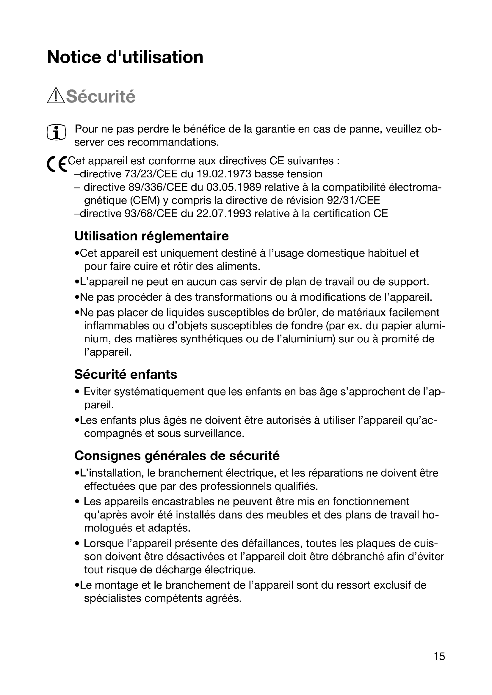 - Ne pas placer de plats de cuisson vides sur les zones de cuisson et ne pas mettre ces dernières en fonctionnement sans récipient.17 Description de l'appareil Equipement de la table de cuisson Commande des foyers Pour faire fonctionner l’appareil, utilisez les commandes des foyers de cuisson de l’appareil combiné. La notice d’utilisation de l’appareil inté- gré vous indiquera le maniement et la fonction des commandes des foyers de cuisson. 1 Avertissement ! Les plaques de cuissons restent chaudes encore quelque temps après avoir mis à l’arrêt l’appareil. Il y a risque de brûlure. Laissez re- froidir les plaques de cuisson. Conseils de cuisson Plats de cuisson Un plat de cuisson de qualité se reconnaît à son type de fond. Le fond doit être aussi plat et épais que possible. Plaque de cuisson 1500W Plaque de cuisson ra- pide Plaque de cuisson 1500W Plaque de cuisson 1000W18 Economie d’énergie 2 Il est impératif de placer les plats de cuis- son sur la plaque de cuisson avant d’ac- tiver cette dernière. 2 Si possible, recouvrez toujours les réci- pients avec leur couvercle. 2 Eteignez la plaque de cuisson avant la fin de la cuisson afin de bénéficier de la cha- leur résiduelle. 2 Veillez à ce que le fond du plat de cuis- son corresponde à la dimension de la plaque de cuisson. Nettoyage et entretien 1 Attention ! Risque de brûlure dû à la chaleur résiduelle. Laissez refroidir l’appareil. Nettoyez l’appareil après chaque utilisation.