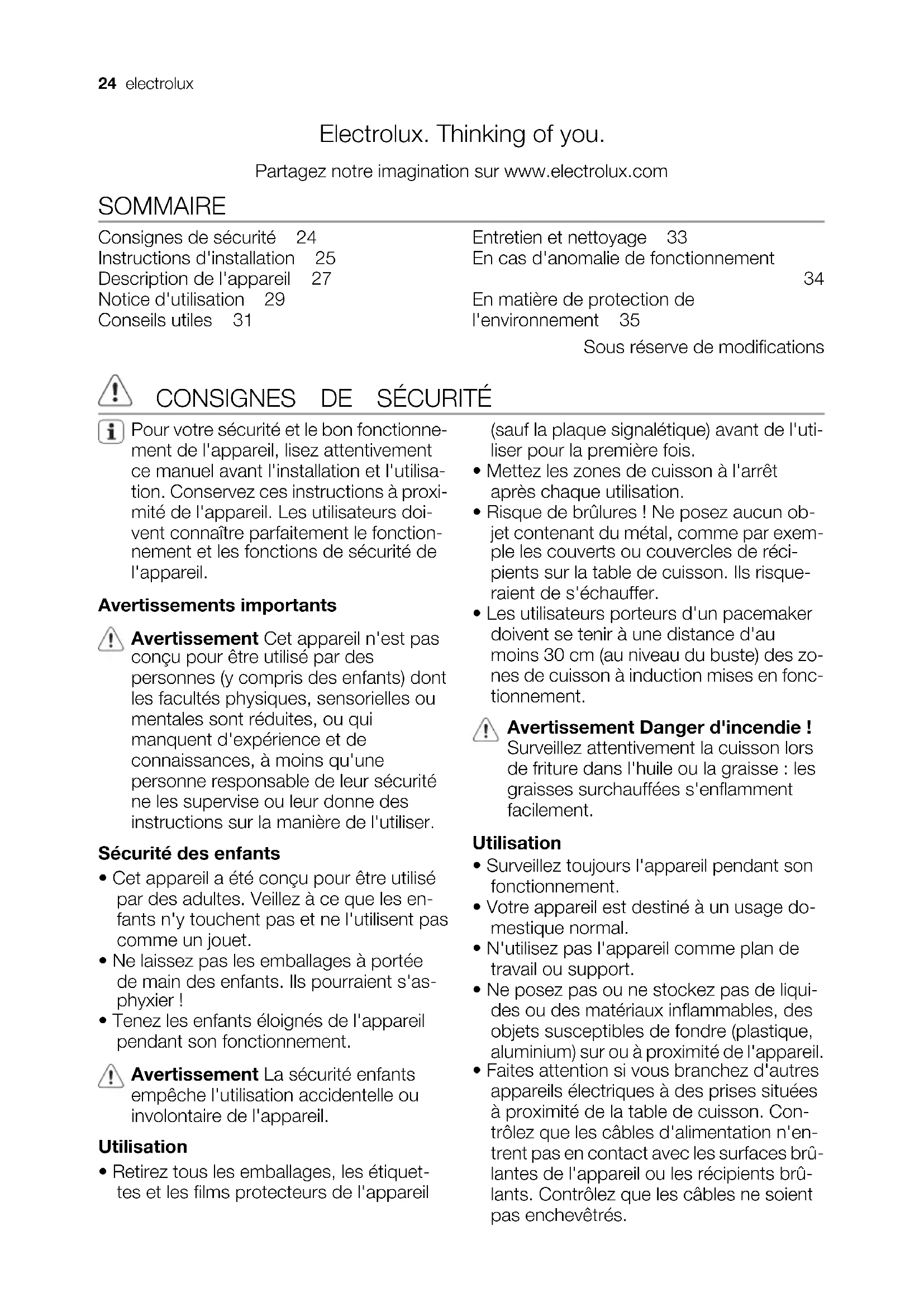 - La protection anti-surchauffe de la zone de cuisson est acti- vée. Mettez la zone de cuisson à l'arrêt. Remettez la zone de cuisson en fonctionnement. et un chiffre s'allument. Erreur du système électronique. Débranchez électriquement l'appareil pendant quelques minutes. Déconnectez le fusible de l'installation électrique de l'habitation. Mettez de nouveau sous tension. Si s'affiche de nouveau, fai- tes appel au Service Après-vente. s'allume Une erreur du système électronique s'est produite parce que vous avez utilisé un récipient vide ou pas adapté à la zone de cuis- son. La protection anti-surchauffe de la zone de cuisson est acti- vée. Le dispositif d'arrêt de sécurité est activé. Mettez l'appareil à l'arrêt. Enlevez le récipient chaud. Au bout d'environ 30 secondes, remettez la zone de cuisson en fonction- nement. doit disparaître, le voyant de chaleur résiduelle res- te allumé. Laissez refroidir le récipient et consultez le chapitre "Ré- cipients de cuisson compatibles avec les zones de cuisson à in- duction". 34 electroluxSi les indications ci-dessus ne vous permet- tent pas de remédier au problème, veuillez vous adresser à votre magasin vendeur ou au Service Après-vente. Veuillez lui fournir les informations figurant sur la plaque signa- létique, la combinaison à 3 lettres et chiffres pour la vitrocéramique (située dans un des coins de la table de cuisson) et le type de message d'erreur qui s'affiche. En cas d'erreur de manipulation de la part de l'utilisateur, le déplacement du techni- cien du Service Après-vente ou du magasin vendeur peut être facturé même en cours de garantie. Les instructions relatives au Ser- vice Après-vente et aux conditions de garan- tie figurent dans le livret de garantie. EN MATIÈRE DE PROTECTION DE L'ENVIRONNEMENT Le symbole sur le produit ou son emballage indique que ce produit ne peut être traité comme déchet ménager. Il doit être remis au point de collecte dédié à cet effet (collecte et recyclage du matériel électrique et électronique). En procédant à la mise au rebut de l'appareil dans les règles de l’art, nous préservons l'environnement et notre sécurité, s’assurant ainsi que les déchets seront traités dans des conditions optimum. Pour obtenir plus de détails sur le recyclage de ce produit, veuillez prendre contact avec les services de votre commune ou le magasin où vous avez effectué l'achat. Emballage Tous les matériaux d'emballage sont écologiques et recyclables. Les compo- sants en plastique sont identifiables grâ- ce aux sigles : >PE<,>PS<, etc. Veuil- lez jeter les matériaux d'emballage dans le conteneur approprié du centre de collecte des déchets de votre com- mune. electrolux 35Electrolux. Thinking of you. Mehr zu unserem Denken finden Sie unter www.electrolux.com INHALT Sicherheitshinweise 36 Montageanleitung 37 Gerätebeschreibung 39 Gebrauchsanweisung 40 Praktische Tipps und Hinweise 43 Reinigung und Pflege 45 Was tun, wenn … 45 Umwelttipps 46 Änderungen vorbehalten SICHERHEITSHINWEISE Lesen Sie diese Bedienungsanleitung bitte sorgfältig durch, bevor Sie das Ge- rät anschließen und benutzen, um Ge- fahren zu vermeiden und einen korrek- ten Betrieb des Geräts zu gewährleis- ten. Bewahren Sie diese Bedienungsan- leitung in der Nähe des Geräts auf, auch wenn Sie dieses anderswo aufstel- len. Wenn Sie das Gerät verkaufen, ge- ben Sie dem Käufer die Bedienungsan- leitung mit. Jeder, der dieses Gerät be- nutzt, sollte mit der Bedienung und den Sicherheitsmerkmalen vertraut sein. Allgemeine Sicherheit Warnung! Erwachsene mit eingeschränkten physischen, sensorischen oder geistigen Fähigkeiten oder einem Mangel an Wissen und Erfahrung sowie Kinder dürfen dieses Gerät nicht benutzen. Solche Personen müssen von einer Person beaufsichtigt oder bei der Bedienung des Geräts angeleitet werden, die für ihre Sicherheit verantwortlich ist. Sicherheit für Kinder