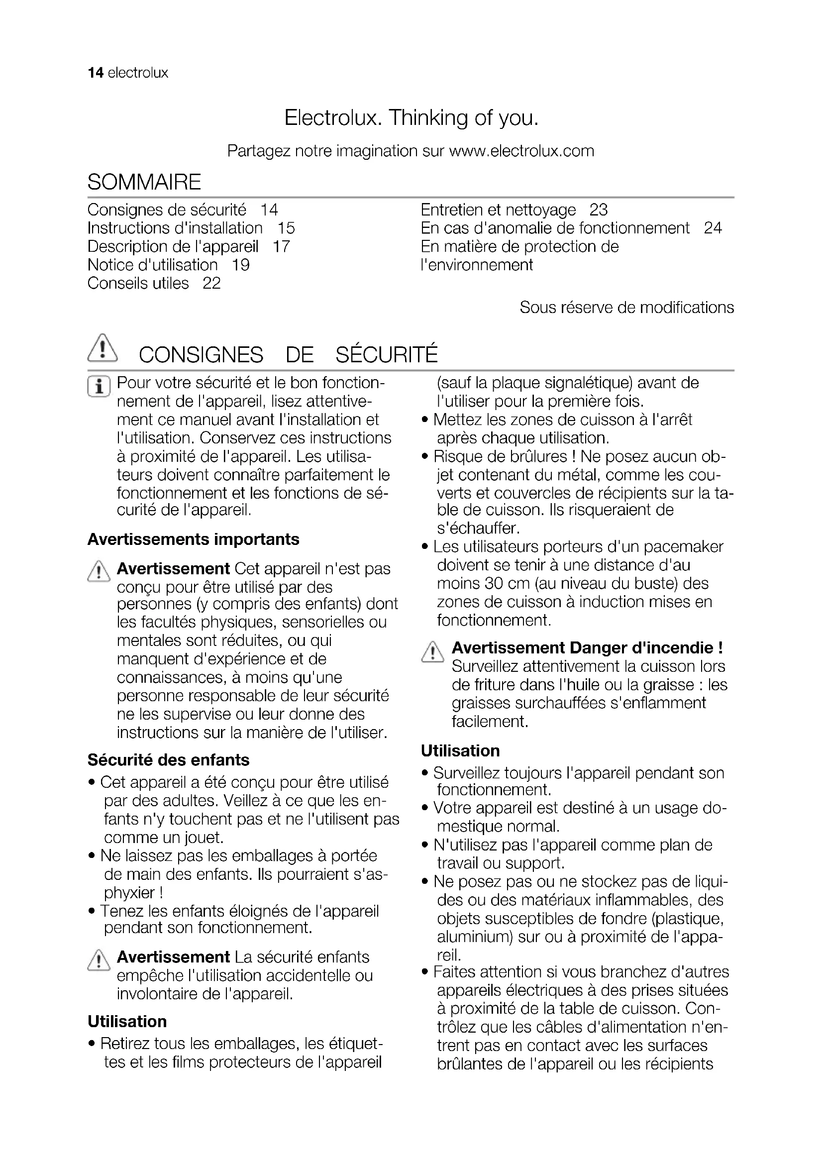 - La protection anti-surchauffe de la zone de cuisson est activée. Mettez la zone de cuisson à l'arrêt. Remettez la zone de cuis- son en fonctionnement. Affichage de et d'un chiffre. Erreur du système électronique. Débranchez l'appareil pendant quelques minutes. Déconnectez le fusible de l'installation électrique domestique. Mettez de nouveau sous tension. Si s'affiche de nouveau, faites appel au Service Après-vente. 24 electroluxAnomalie Cause possible et solution s'allume Une erreur du système électronique s'est produite parce que vous avez utilisé un récipient vide ou qui n'est pas adapté à la zo- ne de cuisson. La protection anti-surchauffe de la zone de cuis- son est activée. Le dispositif d'arrêt de sécurité est activé. Mettez l'appareil à l'arrêt. Enlevez le récipient chaud. Au bout d'environ 30 secondes, remettez la zone de cuisson en fonction- nement. doit disparaître, le voyant de chaleur résiduelle reste allumé. Laissez refroidir le récipient et consultez le chapitre "Réci- pients de cuisson compatibles avec les zones de cuisson à in- duction". Aucun signal sonore ne retentit quand vous appuyez sur les touches Le signal sonore est désactivé. Activez le signal sonore. Si les indications ci-dessus ne vous per- mettent pas de remédier au problème, veuillez vous adresser à votre magasin ven- deur ou au Service Après-vente. Veuillez lui fournir les informations figurant sur la pla- que signalétique, la combinaison à 3 lettres et chiffres pour la vitrocéramique (située dans un des coins de la table de cuisson) et le type de message d'erreur qui s'affiche. En cas d'erreur de manipulation de la part de l'utilisateur, le déplacement du techni- cien du Service Après-vente ou du magasin vendeur peut être facturé même en cours de garantie. Les instructions relatives au Service Après-vente et aux conditions de garantie figurent dans le livret de garantie. EN MATIÈRE DE PROTECTION DE L'ENVIRONNEMENT Le symbole sur le produit ou son emballage indique que ce produit ne peut être traité comme déchet ménager. Il doit être remis au point de collecte dédié à cet effet (collecte et recyclage du matériel électrique et électronique). En procédant à la mise au rebut de l'appareil dans les règles de l’art, nous préservons l'environnement et notre sécurité, s’assurant ainsi que les déchets seront traités dans des conditions optimum. Pour obtenir plus de détails sur le recyclage de ce produit, veuillez prendre contact avec les services de votre commune ou le magasin où vous avez effectué l'achat. Emballage Tous les matériaux d'emballage sont écologiques et recyclables. Les com- posants en plastique sont identifiables grâce aux sigles : >PE<,>PS<, etc. Veuillez jeter les matériaux d'emballage dans le conteneur approprié du centre de collecte des déchets de votre com- mune. electrolux 25Electrolux. Thinking of you. Mehr zu unserem Denken finden Sie unter www.electrolux.com INHALT Sicherheitshinweise 26 Montageanleitung 27 Gerätebeschreibung 29 Gebrauchsanweisung 30 Praktische Tipps und Hinweise 34 Reinigung und Pflege 35 Was tun, wenn … 36 Umwelttipps 37 Änderungen vorbehalten SICHERHEITSHINWEISE Lesen Sie diese Bedienungsanleitung bitte sorgfältig durch, bevor Sie das Gerät anschließen und benutzen, um Gefahren zu vermeiden und einen kor- rekten Betrieb des Geräts zu gewähr- leisten. Bewahren Sie diese Bedie- nungsanleitung in der Nähe des Geräts auf, auch wenn Sie dieses anderswo aufstellen. Wenn Sie das Gerät verkau- fen, geben Sie dem Käufer die Bedie- nungsanleitung mit. Jeder, der dieses Gerät benutzt, sollte mit der Bedienung und den Sicherheitsmerkmalen vertraut sein. Allgemeine Sicherheit Warnung! Erwachsene mit eingeschränkten physischen, sensorischen oder geistigen Fähigkeiten oder einem Mangel an Wissen und Erfahrung sowie Kinder dürfen dieses Gerät nicht benutzen. Solche Personen müssen von einer Person beaufsichtigt oder bei der Bedienung des Geräts angeleitet werden, die für ihre Sicherheit verantwortlich ist. Sicherheit für Kinder