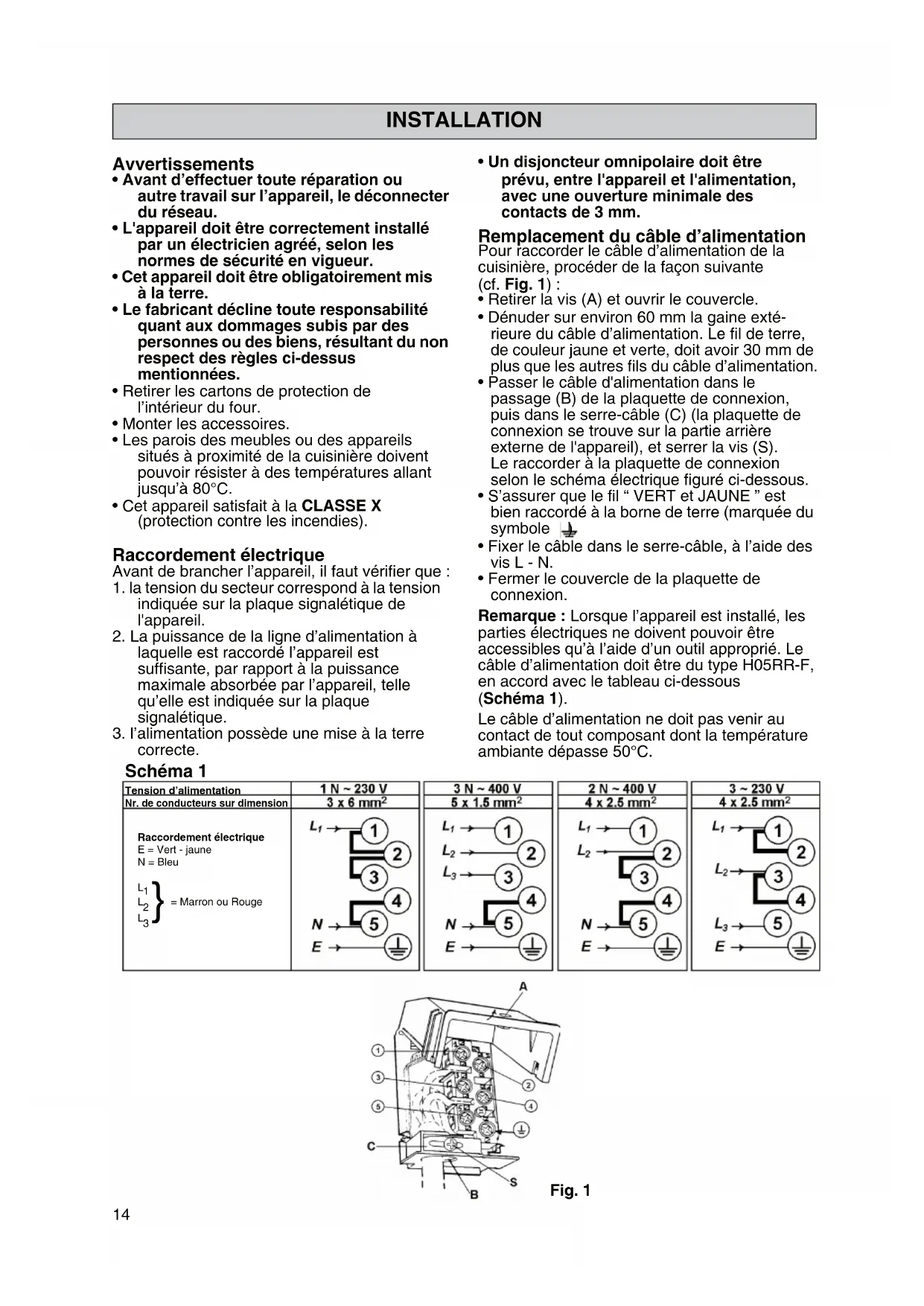 - Un disjoncteur omnipolaire doit être prévu, entre l'appareil et l'alimentation, avec une ouverture minimale des contacts de 3 mm. Remplacement du câble d’alimentation Pour raccorder le câble d’alimentation de la cuisinière, procéder de la façon suivante (cf. Fig. 1) :