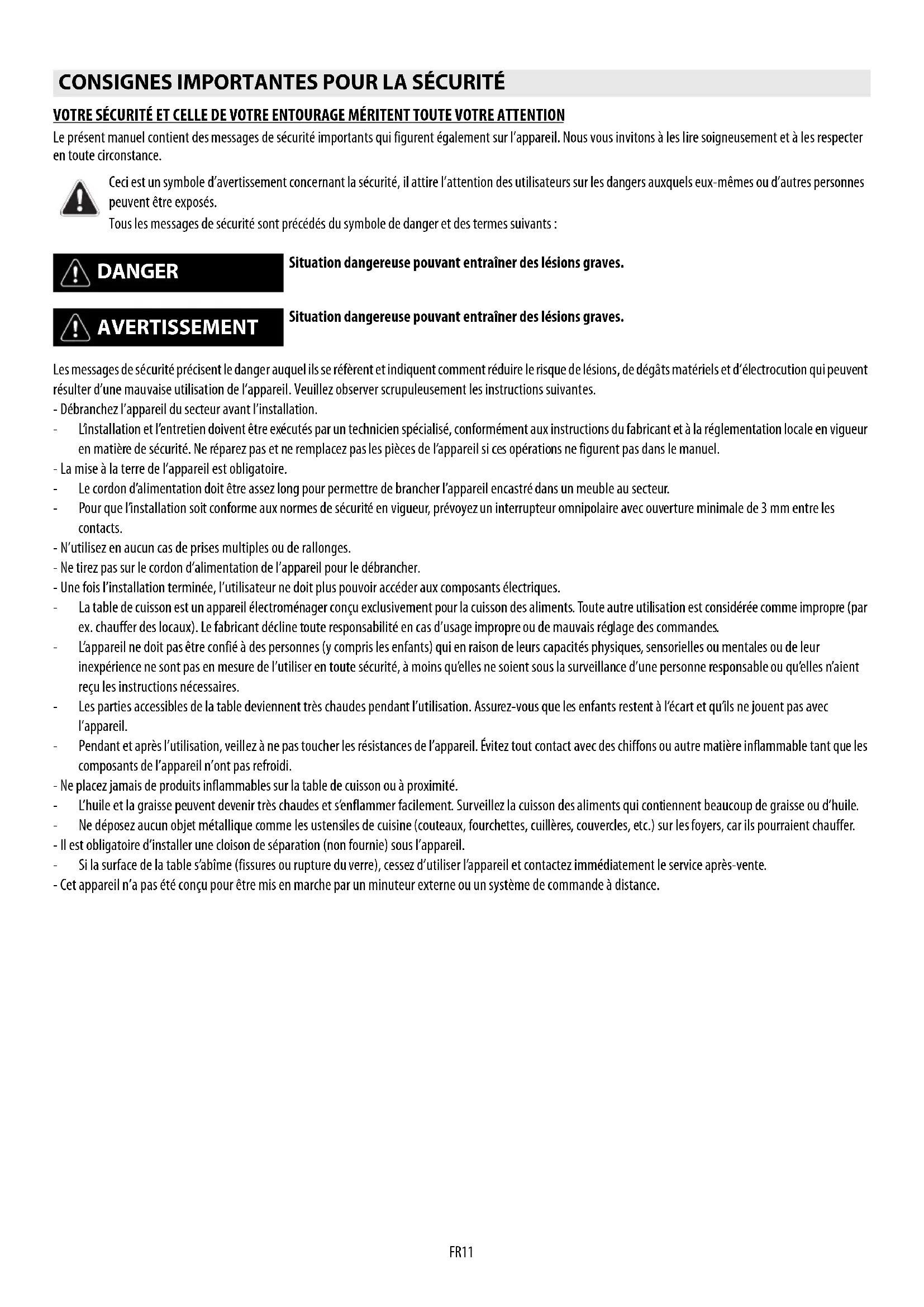 CLEANING WARNING - Do not use steam cleaners. - Before cleaning, make sure the cooking zones are switched off and that the residual heat indicator (“H”) is not displayed. TROUBLESHOOTING GUIDE ERROR CODE DESCRIPTION POSSIBLE CAUSES ERROR ELIMINATION The hob switches off and after 30 seconds emits an acoustic signal every 10 seconds. Permanent pressure on the control zone. Water or kitchen utensils on the control zone. Clean the control zone. A zone switches off and the indicator shows the message “C82”. Overtemperature. The internal temperature of electronic parts is too high. Wait for the hob to cool down before using it again. AFTER-SALES SERVICE Attach here one of the two stickers giving the product data, included in the warranty booklet.FR11 VOTRE SÉCURITÉ ET CELLE DE VOTRE ENTOURAGE MÉRITENT TOUTE VOTRE ATTENTION Le présent manuel contient des messages de sécurité importants qui figurent également sur l’appareil. Nous vous invitons à les lire soigneusement et à les respecter en toute circonstance. Les messages de sécurité précisent le danger auquel ils se réfèrent et indiquent comment réduire le risque de lésions, de dégâts matériels et d’électrocution qui peuvent résulter d’une mauvaise utilisation de l’appareil. Veuillez observer scrupuleusement les instructions suivantes. - Débranchez l’appareil du secteur avant l’installation. - L’installation et l’entretien doivent être exécutés par un technicien spécialisé, conformément aux instructions du fabricant et à la réglementation locale en vigueur en matière de sécurité. Ne réparez pas et ne remplacez pas les pièces de l’appareil si ces opérations ne figurent pas dans le manuel. - La mise à la terre de l’appareil est obligatoire. - Le cordon d’alimentation doit être assez long pour permettre de brancher l’appareil encastré dans un meuble au secteur. - Pour que l’installation soit conforme aux normes de sécurité en vigueur, prévoyez un interrupteur omnipolaire avec ouverture minimale de 3 mm entre les contacts. - N’utilisez en aucun cas de prises multiples ou de rallonges. - Ne tirez pas sur le cordon d’alimentation de l’appareil pour le débrancher. - Une fois l’installation terminée, l’utilisateur ne doit plus pouvoir accéder aux composants électriques. - La table de cuisson est un appareil électroménager conçu exclusivement pour la cuisson des aliments. Toute autre utilisation est considérée comme impropre (par ex. chauffer des locaux). Le fabricant décline toute responsabilité en cas d’usage impropre ou de mauvais réglage des commandes. - L’appareil ne doit pas être confié à des personnes (y compris les enfants) qui en raison de leurs capacités physiques, sensorielles ou mentales ou de leur inexpérience ne sont pas en mesure de l’utiliser en toute sécurité, à moins qu’elles ne soient sous la surveillance d’une personne responsable ou qu’elles n’aient reçu les instructions nécessaires. - Les parties accessibles de la table deviennent très chaudes pendant l’utilisation. Assurez-vous que les enfants restent à l’écart et qu’ils ne jouent pas avec l’appareil. - Pendant et après l’utilisation, veillez à ne pas toucher les résistances de l’appareil. Évitez tout contact avec des chiffons ou autre matière inflammable tant que les composants de l’appareil n’ont pas refroidi. - Ne placez jamais de produits inflammables sur la table de cuisson ou à proximité. - L’huile et la graisse peuvent devenir très chaudes et s’enflammer facilement. Surveillez la cuisson des aliments qui contiennent beaucoup de graisse ou d’huile. - Ne déposez aucun objet métallique comme les ustensiles de cuisine (couteaux, fourchettes, cuillères, couvercles, etc.) sur les foyers, car ils pourraient chauffer. - Il est obligatoire d’installer une cloison de séparation (non fournie) sous l’appareil. - Si la surface de la table s’abîme (fissures ou rupture du verre), cessez d’utiliser l’appareil et contactez immédiatement le service après-vente. - Cet appareil n’a pas été conçu pour être mis en marche par un minuteur externe ou un système de commande à distance.