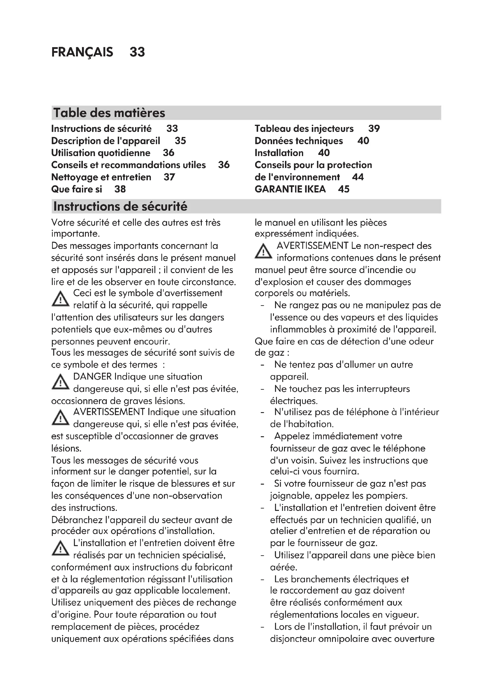 GehenSiedazuaufdieletzte SeitedieserBroschüre.Dort ndenSieeineÜbersichtmitden entsprechendenTelefonnummern undKontaktdatenunserer autorisiertenKundendienste. DamitwirIhnenimFalleeiner Störungjederzeitschnellhelfen können,bittenwirSie,dieindiesem HandbuchaufgeführtenRufnummern zuverwenden.WendenSiesich jeweilsandiefürdenbetreffenden GerätetypangegebeneRufnummer. HaltenSiedazubittedie(8-stellige) IKEAArtikelnummerunddieDEUTSCH 32 12-stelligeServicenummer(aufdem Geräte-Typschildvermerkt)Ihres IKEAGerätesbereit. BEWAHRENSIEDENKAUFBELEG GUTAUF! UnserServicekanneinen GarantieanspruchnurunterVorlage diesesBelegesakzeptieren.Auf demKaufbelegistauchdieIKEA BezeichnungundArtikelnummer (8-stelligerCode)fürjedesderGeräte, dieSiegekaufthaben,vermerkt. BenötigenSieweiterenRatund Unterstützung? Beiallenanderen,nicht kundendienstspezischenFragen,bitten wirSie,sichanIhrnächstgelegenesIKEA- Einrichtungshauszuwenden.Wirempfehlen Ihnen,sichvorherdiedemGerätbeigefügten Unterlagengenauestensdurchzulesen.FRANÇAIS 33 Votresécuritéetcelledesautresesttrès importante. Desmessagesimportantsconcernantla sécuritésontinsérésdansleprésentmanuel etapposéssurl'appareil;ilconvientdeles lireetdelesobserverentoutecirconstance. Ceciestlesymboled'avertissement relatifàlasécurité,quirappelle l'attentiondesutilisateurssurlesdangers potentielsqueeux-mêmesoud'autres personnespeuventencourir. Touslesmessagesdesécuritésontsuivisde cesymboleetdestermes: DANGERIndiqueunesituation dangereusequi,siellen'estpasévitée, occasionneradegraveslésions. AVERTISSEMENTIndiqueunesituation dangereusequi,siellen'estpasévitée, estsusceptibled'occasionnerdegraves lésions. Touslesmessagesdesécuritévous informentsurledangerpotentiel,surla façondelimiterlerisquedeblessuresetsur lesconséquencesd'unenon-observation desinstructions. Débranchezl'appareildusecteuravantde procéderauxopérationsd'installation. L'installationetl'entretiendoiventêtre réalisésparuntechnicienspécialisé, conformémentauxinstructionsdufabricant etàlaréglementationrégissantl'utilisation d'appareilsaugazapplicablelocalement. Utilisezuniquementdespiècesderechange d'origine.Pourtouteréparationoutout remplacementdepièces,procédez uniquementauxopérationsspéciéesdans lemanuelenutilisantlespièces expressémentindiquées. AVERTISSEMENTLenon-respectdes informationscontenuesdansleprésent manuelpeutêtresourced'incendieou d'explosionetcauserdesdommages corporelsoumatériels. - Nerangezpasounemanipulezpasde l'essenceoudesvapeursetdesliquides inammablesàproximitédel'appareil. Quefaireencasdedétectiond'uneodeur degaz: - Netentezpasd'allumerunautre appareil. - Netouchezpaslesinterrupteurs électriques. - N'utilisezpasdetéléphoneàl'intérieur del'habitation. - Appelezimmédiatementvotre fournisseurdegazavecletéléphone d'unvoisin.Suivezlesinstructionsque celui-civousfournira. - Sivotrefournisseurdegazn'estpas joignable,appelezlespompiers. - L'installationetl'entretiendoiventêtre effectuésparuntechnicienqualié,un atelierd'entretienetderéparationou parlefournisseurdegaz. - Utilisezl'appareildansunepiècebien aérée. - Lesbranchementsélectriqueset leraccordementaugazdoivent êtreréalisésconformémentaux réglementationslocalesenvigueur. - Lorsdel'installation,ilfautprévoirun disjoncteuromnipolaireavecouverture Instructionsdesécurité 33 Descriptiondel'appareil 35 Utilisationquotidienne 36 Conseilsetrecommandationsutiles 36 Nettoyageetentretien 37 Quefairesi 38 Tableaudesinjecteurs 39 Donnéestechniques 40 Installation 40 Conseilspourlaprotection del'environnement 44 GARANTIEIKEA 45 Instructionsdesécurité TabledesmatièresFRANÇAIS 34 descontactsde3mmminimumassurant unedéconnexioncomplète. - Lamiseàlaterredel'appareilest obligatoire. - Lecordond'alimentationdoitêtre sufsammentlongpourpermettrele branchementdel'appareilunefois installédanssonlogement - Effectuezleraccordementaugazà l'aided'unexibleoud'untuyauen métalrigide. - Sicelas'avèrenécessaire,ilconvient deremplacerlecordond'alimentation exclusivementparuncordonpossédant lesmêmescaractéristiquesquecelui d'originefourniparlefabricant(type H05V2V2-F90°CouH05RR-F).Cette opérationdoitêtreréaliséeparun électricienqualié. - Lefabricantdéclinetouteresponsabilité encasdeblessurecauséeàdes personnesoudesanimauxouencasde dommagematérielrésultantdunon- respectdecesconsignes. - N'utiliseznirallonge,niadaptateur multiple. - Netirezpassurlecordond'alimentation pourdébrancherl'appareil. - Unefoisl'installationterminée, l'utilisateurnedevrapluspouvoir accéderauxcomposantsélectriques. - Évitezdetoucherl'appareilavecles mainsmouilléesetlorsquevousêtes piedsnus. - Cettetabledecuisson(Classe3)est exclusivementconçuecommeappareil decuisson.N'utilisezjamaiscetappareil pourchaufferunepièce.Ilenrésulterait unrisqued'intoxicationaumonoxydede carboneetunesurchauffedelatablede cuisson. - Lefabricantdéclinetouteresponsabilité encasd'utilisationincorrecteoude mauvaisréglagesdescommandes. - Lespersonnes(ycomprislesenfants) qui,enraisondeleurscapacités physiques,sensoriellesoumentales, deleurinexpérienceoudeleur méconnaissance,nesontpasenmesure d'utiliserl'appareilentoutesécurité, doiventseservirdecelui-ciuniquement souslasurveillanceouavecles instructionsd'unepersonneresponsable. - Veillezàtenirlesenfantshorsdeportée del'appareil.Contrôlezquelesenfants nejouentpasavecl'appareil. - L'utilisationd'unappareilàgazproduit delachaleuretdel'humiditéàl'intérieur delapièce.Veillezàcequelapièce soitaéréecorrectementouinstallez unehotteaspirantedotéed'unconduit d'évacuation. - Encasd'utilisationprolongée,ilpeut s'avérernécessaired'aérerdavantage lapièce,soitenouvrantunefenêtre,soit enaugmentantlapuissanced'aspiration delahotte. - Aprèsutilisation,assurez-vousqueles boutonssontbienenpositiond'Arrêt (OFF)etfermezlerobinetprincipal d'arrivéedugazoulerobinetdela bouteilledegaz. - L'huileetlagraissepeuventdevenir trèschaudesets'enammerfacilement. Su