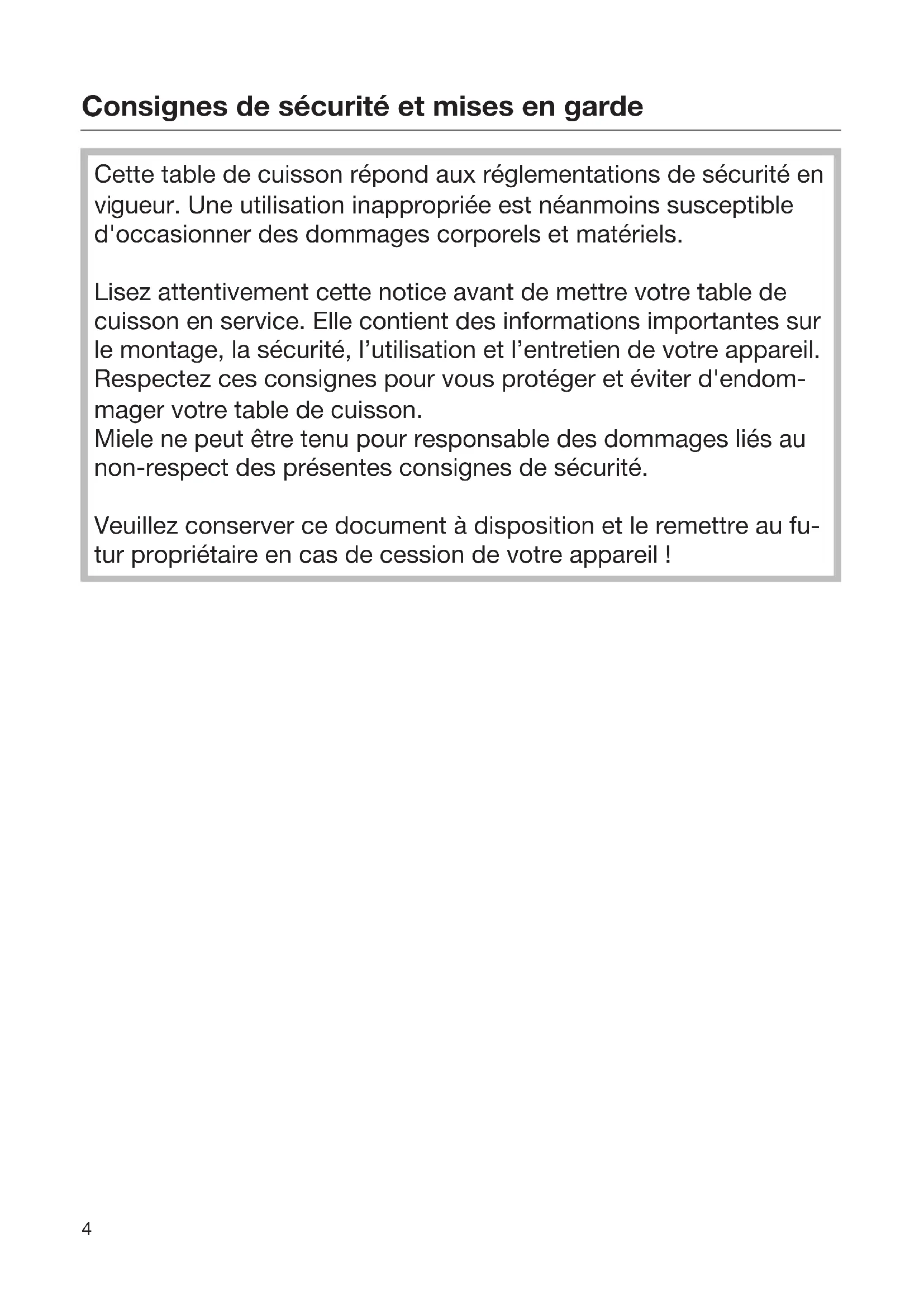 Miele ne peut être tenu pour responsable des dommages liés au non-respect des générées consignes de sécurité.