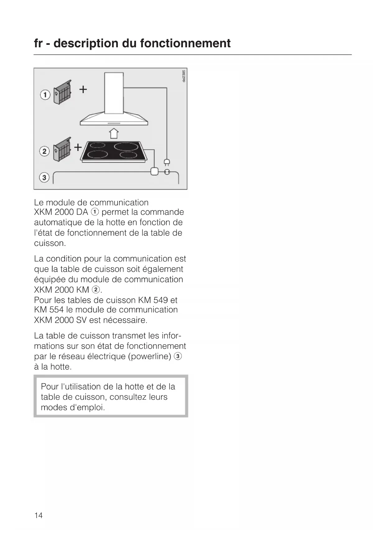 dai2385XKM 2000 DA est fourni avec le module de communication, un étui de montage dans lequel le module est inséré et le câble de connexion avec connecteur pour le raccordement à l'unité de com- mande de la hotte. L'ensemble est monté dans la hotte vers le moteur et relié à la commande de la hotte. Le montage et le raccordement élec- trique sont décrits dans la notice de montage. Ce module de communication doit impérativement être installé par un électricien qui connaît et respecte les prescriptions nationales et re- commandations de la compagnie distributrice d'électricité. fr - description du fonctionnement