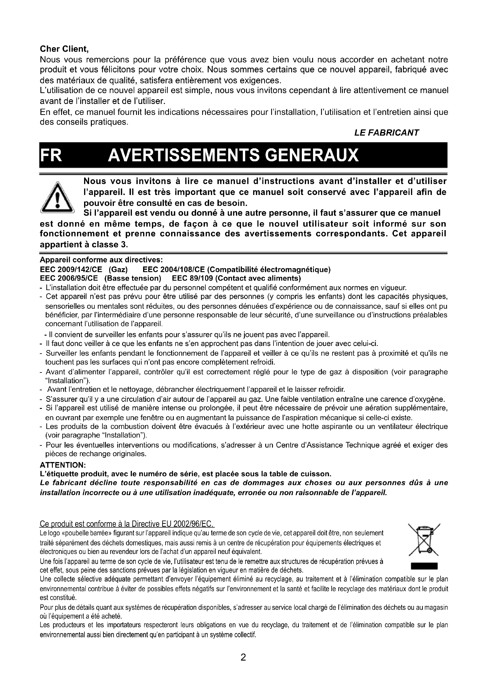 Nous vous invitons à lire ce manuel d’instructions avant d’installer et d’utiliser l’appareil. Il est très important que ce manuel soit conservé avec l’appareil afin de pouvoir être consulté en cas de besoin. Si l’appareil est vendu ou donné à une autre personne, il faut s’assurer que ce manuel est donné en même temps, de façon à ce que le nouvel utilisateur soit informé sur son fonctionnement et prenne connaissance des avertissements correspondants. Cet appareil appartient à classe 3. Appareil conforme aux directives: EEC 2009/142/CE (Gaz) EEC 2004/108/CE (Compatibilité électromagnétique) EEC 2006/95/CE (Basse tension) EEC 89/109 (Contact avec aliments) - L’installation doit être effectuée par du personnel compétent et qualifié conformément aux normes en vigueur. - Cet appareil n’est pas prévu pour être utilisé par des personnes (y compris les enfants) dont les capacités physiques, sensorielles ou mentales sont réduites, ou des personnes dénuées d’expérience ou de connaissance, sauf si elles ont pu bénéficier, par l’intermédiaire d’une personne responsable de leur sécurité, d’une surveillance ou d’instructions préalables concernant l’utilisation de l’appareil. - Il convient de surveiller les enfants pour s’assurer qu’ils ne jouent pas avec l’appareil. - Il faut donc veiller à ce que les enfants ne s’en approchent pas dans l’intention de jouer avec celui-ci. - Surveiller les enfants pendant le fonctionnement de l’appareil et veiller à ce qu’ils ne restent pas à proximité et qu’ils ne touchent pas les surfaces qui n’ont pas encore complètement refroidi. - Avant d’alimenter l’appareil, contrôler qu’il est correctement réglé pour le type de gaz à disposition (voir paragraphe “Installation”). - Avant l’entretien et le nettoyage, débrancher électriquement l’appareil et le laisser refroidir. - S’assurer qu’il y a une circulation d’air autour de l’appareil au gaz. Une faible ventilation entraîne une carence d’oxygène. - Si l’appareil est utilisé de manière intense ou prolongée, il peut être nécessaire de prévoir une aération supplémentaire, en ouvrant par exemple une fenêtre ou en augmentant la puissance de l’aspiration mécanique si celle-ci existe. - Les produits de la combustion doivent être évacués à l’extérieur avec une hotte aspirante ou un ventilateur électrique (voir paragraphe “Installation”). - Pour les éventuelles interventions ou modifications, s’adresser à un Centre d’Assistance Technique agréé et exiger des pièces de rechange originales. ATTENTION: L’étiquette produit, avec le numéro de série, est placée sous la table de cuisson. Le fabricant décline toute responsabilité en cas de dommages aux choses ou aux personnes dûs à une installation incorrecte ou à une utilisation inadéquate, erronée ou non raisonnable de l’appareil. Ce produit est conforme à la Directive EU 2002/96/EC. Le logo «poubelle barrée» gurant sur l’appareil indique qu’au terme de son cycle de vie, cet appareil doit être, non seulement traité séparément des déchets domestiques, mais aussi remis à un centre de récupération pour équipements électriques et électroniques ou bien au revendeur lors de l’achat d’un appareil neuf équivalent. Une fois l’appareil au terme de son cycle de vie, l’utilisateur est tenu de le remettre aux structures de récupération prévues à cet effet, sous peine des sanctions prévues par la législation en vigueur en matière de déchets. Une collecte sélective adéquate permettant d’envoyer l’équipement éliminé au recyclage, au traitement et à l’élimination compatible sur le plan environnemental contribue à éviter de possibles effets négatifs sur l’environnement et la santé et facilite le recyclage des matériaux dont le produit est constitué. Pour plus de détails quant aux systèmes de récupération disponibles, s’adresser au service local chargé de l’élimination des déchets ou au magasin où l’équipement a été acheté. Les producteurs et les importateurs respecteront leurs obligations en vue du recyclage, du traitement et de l’élimination compatible sur le plan environnemental aussi bien directement qu’en participant à un système collectif.3