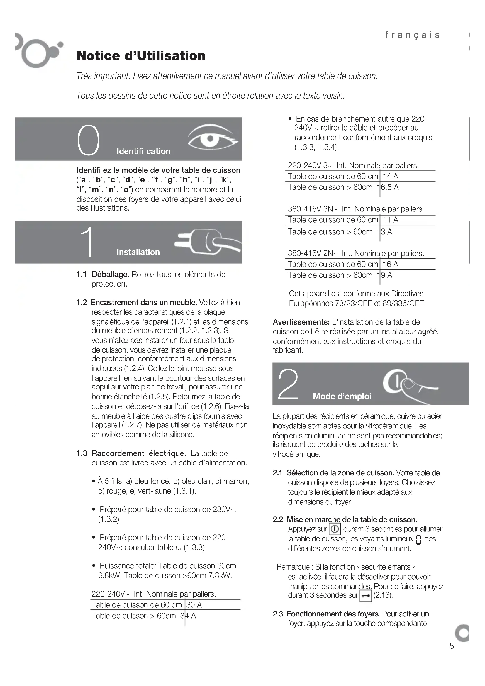 Installation Mode d’emploi Identifi ez le modèle de votre table de cuisson (“a”, “b”, “c”, “d”, “e”, “f”, “g”, “h”, “i”, “j”, “k”, “l”, “m”, “n”, “o”) en comparant le nombre et la disposition des foyers de votre appareil avec celui des illustrations.1.1 Déballage. Retirez tous les éléments de protection.1.2 Encastrement dans un meuble. Veillez à bien respecter les caractéristiques de la plaque signalétique de l’appareil (1.2.1) et les dimensions du meuble d’encastrement (1.2.2, 1.2.3). Si vous n’allez pas installer un four sous la table de cuisson, vous devrez installer une plaque de protection, conformément aux dimensions indiquées (1.2.4). Collez le joint mousse sous l’appareil, en suivant le pourtour des surfaces en appui sur votre plan de travail, pour assurer une bonne étanchéité (1.2.5). Retournez la table de cuisson et déposez-la sur l’orifi ce (1.2.6). Fixez-la au meuble à l’aide des quatre clips fournis avec l’appareil (1.2.7). Ne pas utiliser de matériaux non amovibles comme de la silicone.1.3 Raccordement électrique. La table de cuisson est livrée avec un câble d’alimentation.• À 5 fi ls: a) bleu foncé, b) bleu clair, c) marron, d) rouge, e) vert-jaune (1.3.1).• Préparé pour table de cuisson de 230V~. (1.3.2)• Préparé pour table de cuisson de 220-240V~: consulter tableau (1.3.3)• Puissance totale: Table de cuisson 60cm 6,8kW, Table de cuisson >60cm 7,8kW.220-240V~ Int. Nominale par paliers.Table de cuisson de 60 cm 30 ATable de cuisson > 60cm 34 A
