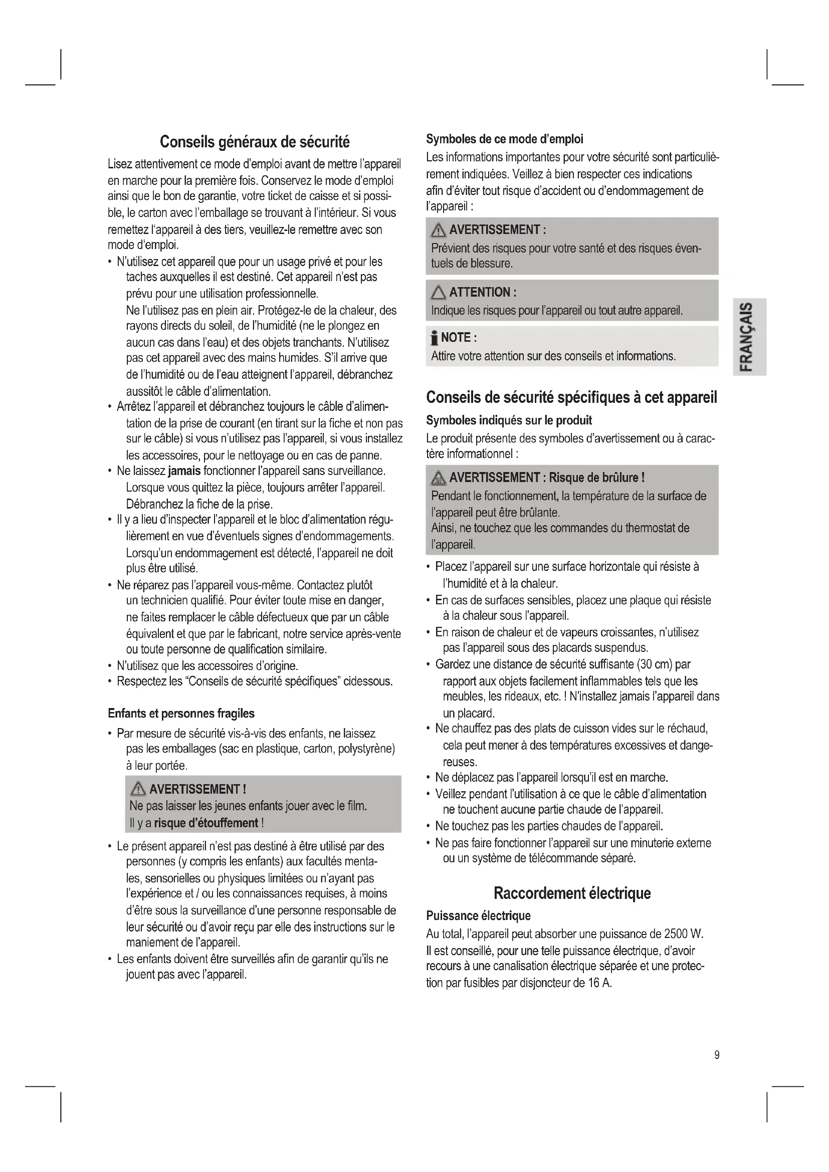 - Ne pas faire fonctionner l’appareil sur une minuterie externe ou un système de télécommande séparé. Raccordement électrique Puissance électrique Au total, l’appareil peut absorber une puissance de 2500 W. Il est conseillé, pour une telle puissance électrique, d’avoir recours à une canalisation électrique séparée et une protec- tion par fusibles par disjoncteur de 16 A.10 ATTENTION : SURCHARGE !