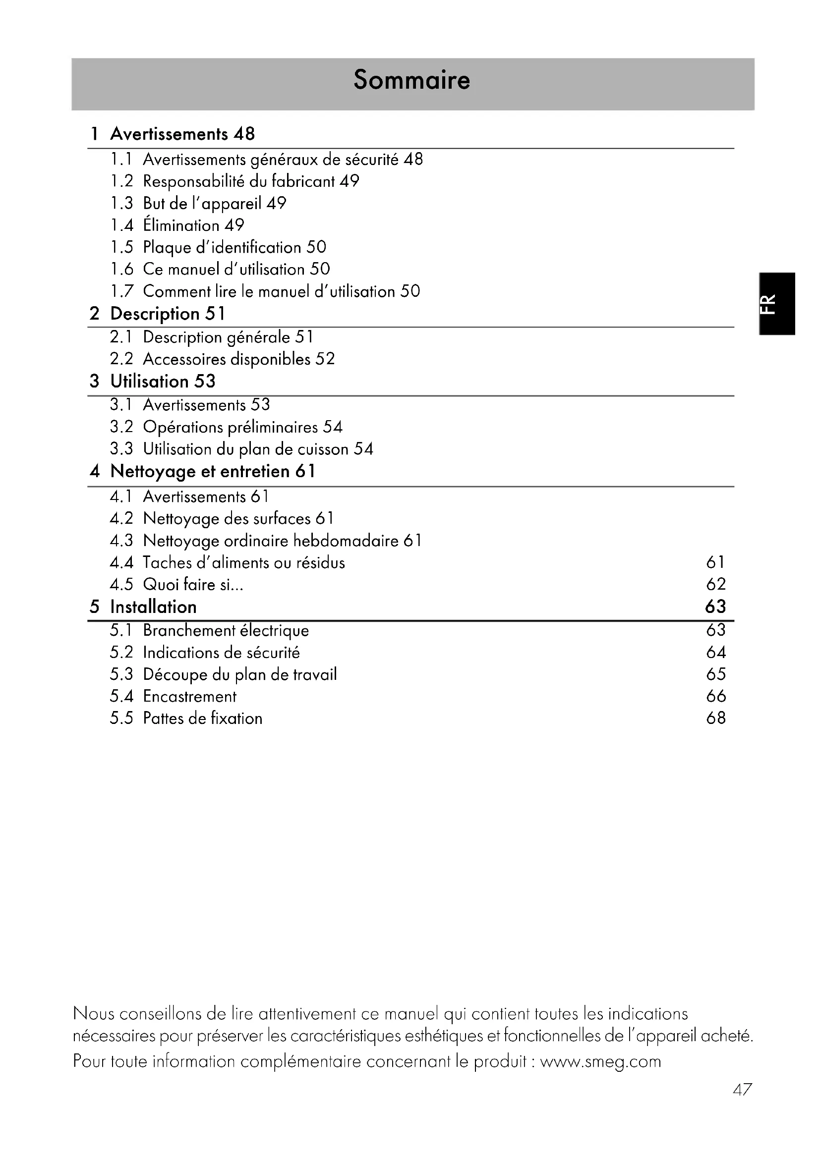 Nous conseillons de lire attentivement ce manuel qui contient toutes les indications nécessaires pour préserver les caractéristiques esthétiques et fonctionnelles de l’appareil acheté. Pour toute information complémentaire concernant le produit : www.smeg.comAvertissements