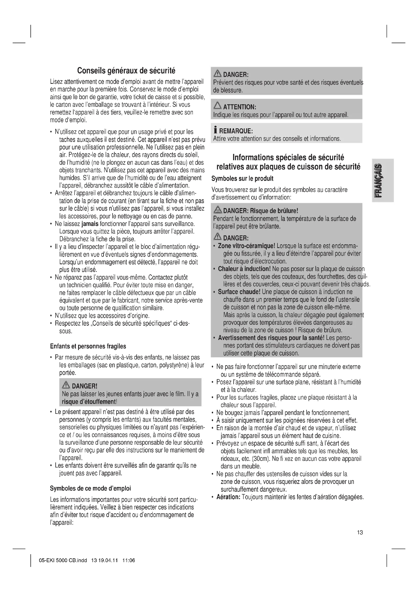 - Subitement, la plaque de cuisson s’éteint pendant la cuisson. Cause possible: La protection anti-surchauffement a été sollicitée. 05-EKI 5000 CB.indd 15 19.04.11 11:0616 FRANÇAIS Remède: Débranchez l’appareil du secteur et laissez-le refroidir pen- dant env. 20 min. Ensuite, remettez-le en marche. Autre cause: Les fentes d’aération sont obstruées. Remède: Dégagez les fentes d’aération de tout corps étranger. Autre cause: La plaque de cuisson a été arrêtée automatiquement après 120 minutes. Alarmes Pendant le fonctionnement, les messages suivants apparaissent à l’écran: Message E1,E2, E4, E5, Eb, EC Dans ce cas, il y a un problème au niveau de la commande électrique. E3, E6 Température surélevée. Cf. ci-dessous sous dépannage. E7, E8 Surtension ou sous-voltage. Vérifiez le réseau du secteur! Données techniques Modèle:..................................................................... EKI 5000 CB Alimentation: ................................................220–240 V, 50/60 Hz Consommation: .................................................................2000 W Classe de protection: ..................................................................II Poids net: ..........................................................................2,33 kg Cet appareil a été contrôlé d’après toutes les directives euro- péennes actuelles applicables, comme par exemple concernant la compatibilité électromagnétique et la basse tension. Cet ap- pareil a été fabriqué en respect des réglementations techniques de sécurité les plus récentes. Sous réserve de modifications techniques. Signification du symbole „Elimination“ Protégez votre environnement, ne jetez pas vos appareils électriques avec les ordures ménagères. Utilisez, pour l’élimination de vos appareils électriques, les bornes de collecte prévues à cet effet où vous pouvez vous débarrasser des appareils que vous n’utilisez plus. Vous contribuez ainsi à éviter les impacts potentiels dans l’envi- ronnement et sur la santé de chacun, causés par une mauvaise élimination de ces déchets. Vous contribuez aussi au recyclage sous toutes ses formes des appareils électriques et électroniques usagés. Vous trouverez toutes les informations sur les bornes d’élimina- tion des appareils auprès de votre commune ou de l’administra- tion de votre communauté. 05-EKI 5000 CB.indd 16 19.04.11 11:0617 ESPAÑOL Indicaciones generales de seguridad Antes de la puesta en servicio de este aparato lea detenida- mente el manual de instrucciones y guarde éste bien incluido la garantía, el recibo de pago y si es posible también el cartón de embalaje con el embalaje interior. En caso de dejar el aparato a terceros, también entregue el manual de instrucciones.