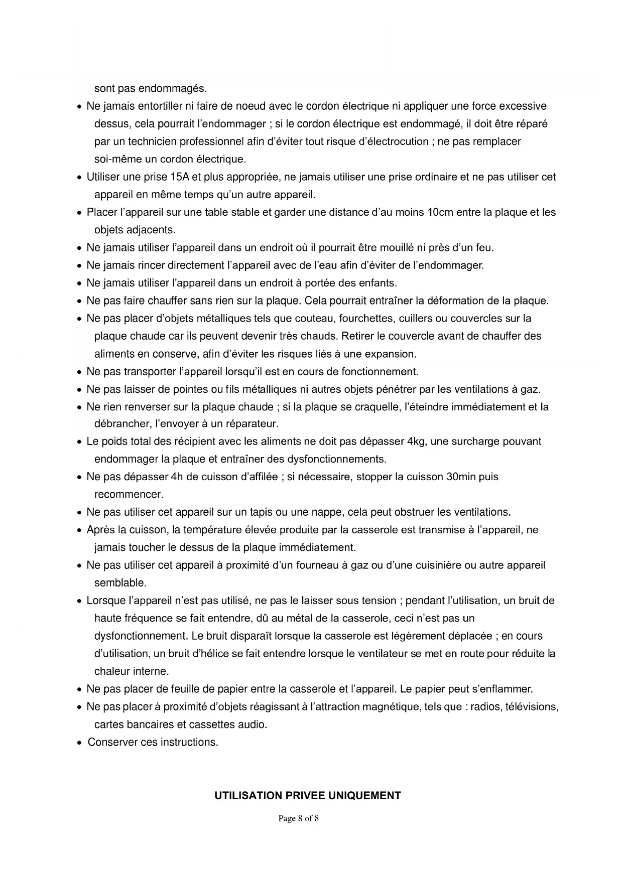 PRECAUTIONS IMPORTANTES Lire toutes les instructions avant utilisation. Ne pas démonter ni ajouter des éléments ou réparer soi-même la plaque à induction. Ne pas toucher la prise avec des mains humides ; lorsque le cordon est endommagé ou que la prise n’est pas bien insérée, ne pas utiliser l’appareil. Vérifier régulièrement que le cordon et la prise nePage 8 of 8 sont pas endommagés. Ne jamais entortiller ni faire de noeud avec le cordon électrique ni appliquer une force excessive dessus, cela pourrait l’endommager ; si le cordon électrique est endommagé, il doit être réparé par un technicien professionnel afin d’éviter tout risque d’électrocution ; ne pas remplacer soi-même un cordon électrique. Utiliser une prise 15A et plus appropriée, ne jamais utiliser une prise ordinaire et ne pas utiliser cet appareil en même temps qu’un autre appareil. Placer l’appareil sur une table stable et garder une distance d’au moins 10cm entre la plaque et les objets adjacents. Ne jamais utiliser l’appareil dans un endroit où il pourrait être mouillé ni près d’un feu. Ne jamais rincer directement l’appareil avec de l’eau afin d’éviter de l’endommager. Ne jamais utiliser l’appareil dans un endroit à portée des enfants. Ne pas faire chauffer sans rien sur la plaque. Cela pourrait entraîner la déformation de la plaque. Ne pas placer d’objets métalliques tels que couteau, fourchettes, cuillers ou couvercles sur la plaque chaude car ils peuvent devenir très chauds. Retirer le couvercle avant de chauffer des aliments en conserve, afin d’éviter les risques liés à une expansion. Ne pas transporter l’appareil lorsqu’il est en cours de fonctionnement. Ne pas laisser de pointes ou fils métalliques ni autres objets pénétrer par les ventilations à gaz. Ne rien renverser sur la plaque chaude ; si la plaque se craquelle, l’éteindre immédiatement et la débrancher, l’envoyer à un réparateur. Le poids total des récipient avec les aliments ne doit pas dépasser 4kg, une surcharge pouvant endommager la plaque et entraîner des dysfonctionnements. Ne pas dépasser 4h de cuisson d’affilée ; si nécessaire, stopper la cuisson 30min puis recommencer. Ne pas utiliser cet appareil sur un tapis ou une nappe, cela peut obstruer les ventilations. Après la cuisson, la température élevée produite par la casserole est transmise à l’appareil, ne jamais toucher le dessus de la plaque immédiatement. Ne pas utiliser cet appareil à proximité d’un fourneau à gaz ou d’une cuisinière ou autre appareil semblable. Lorsque l’appareil n’est pas utilisé, ne pas le laisser sous tension ; pendant l’utilisation, un bruit de haute fréquence se fait entendre, dû au métal de la casserole, ceci n’est pas un dysfonctionnement. Le bruit disparaît lorsque la casserole est légèrement déplacée ; en cours d’utilisation, un bruit d’hélice se fait entendre lorsque le ventilateur se met en route pour réduite la chaleur interne. Ne pas placer de feuille de papier entre la casserole et l’appareil. Le papier peut s’enflammer. Ne pas placer à proximité d’objets réagissant à l’attraction magnétique, tels que : radios, télévisions, cartes bancaires et cassettes audio. Conserver ces instructions.