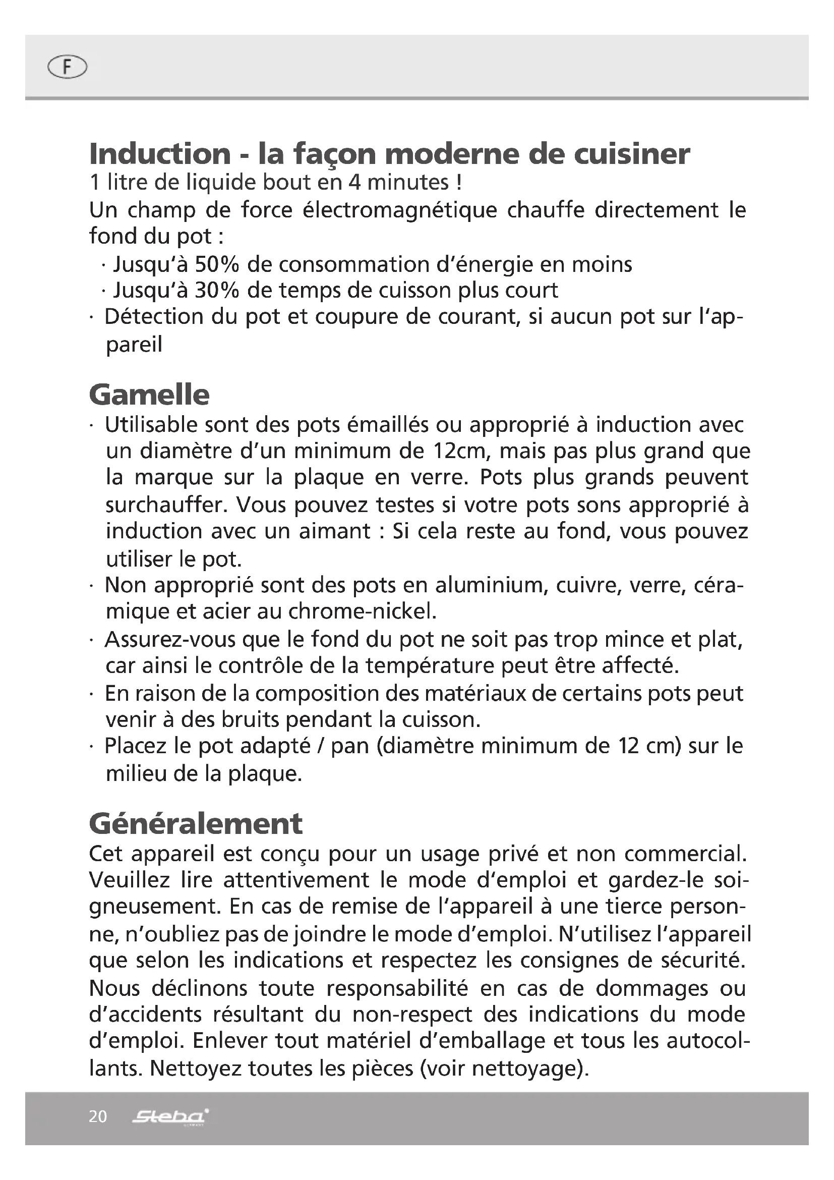 Utilisable sont des pots émaillés ou appropriés à induction avec un diamètre d'un minimum de 12cm, mais pas plus grand que la marque sur la plaque en verre. Pots plus grands peuvent surchauffer. Vous pouvez tester si vos pots sont appropriés à induction avec un aimant : Si cela reste au fond, vous pouvez utiliser le pot. - Non appropriés sont des pots en aluminium, cuivre, verre, céramique et acier au chrome-nickel. Assurez-vous que le fond du pot ne soit pas trop mince et plat, car ainsi le contrôle de la température peut être affecté. - En raison de la composition des matériaux de certains pots peut venir à des bruits pendant la cuisson. - Placez le pot adapté / pan (diamètre minimum de 12 cm) sur le milieu de la plaque.