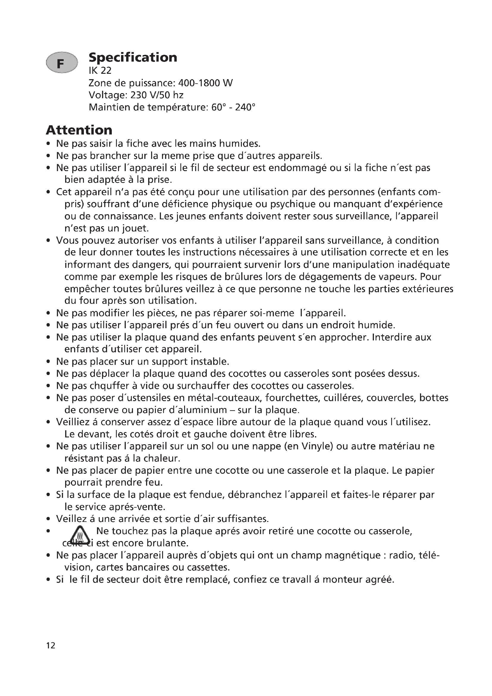 - Ne pas utiliser la plaque quand des enfants peuvent s´en approcher. Interdire aux enfants d´utiliser cet appareil.